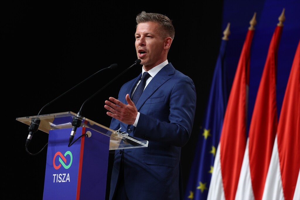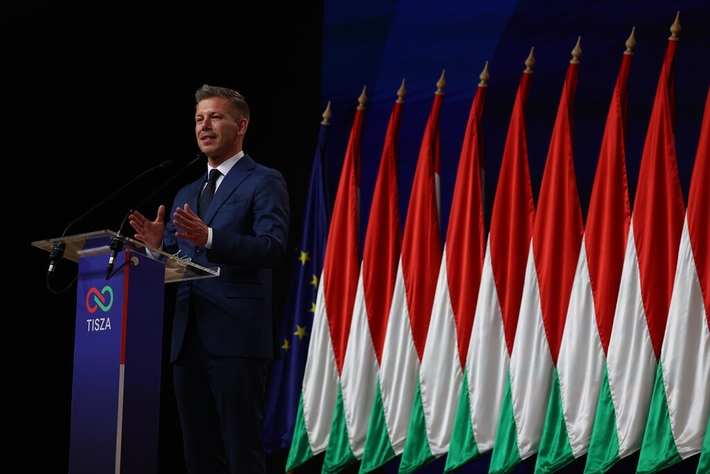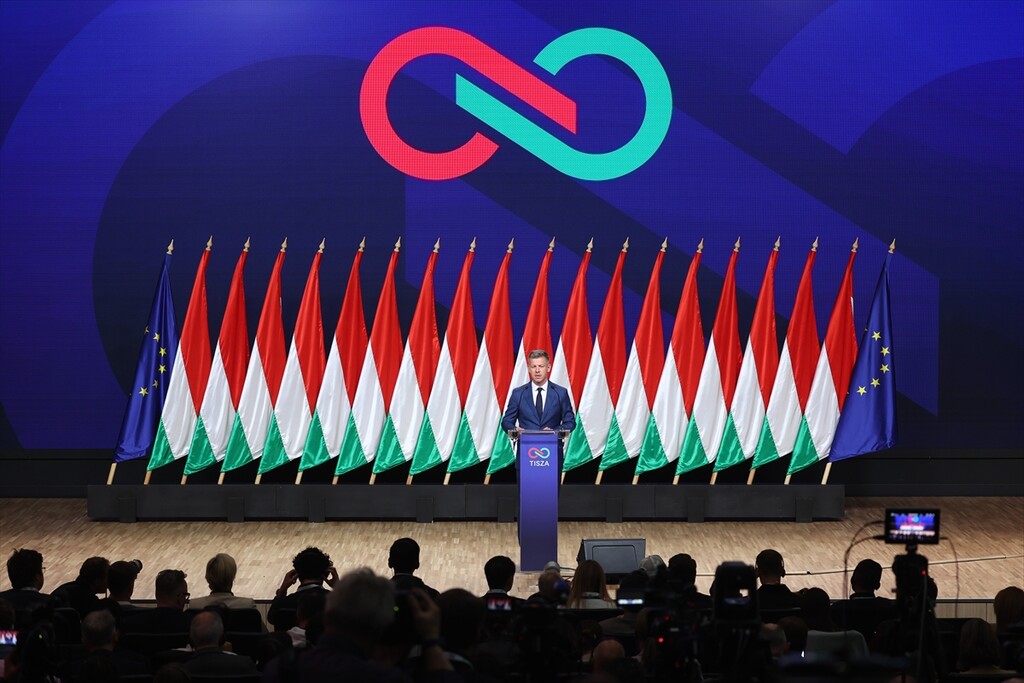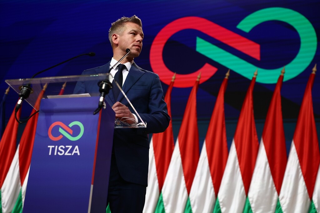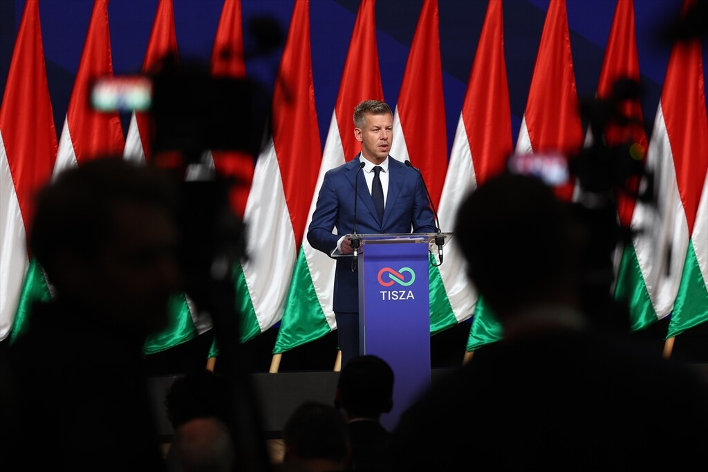 Peter Magyar, leader of the pro-European conservative TISZA party, delivers a speech during a press conference at the HUNGEXPO Congress and Exhibition Center in Budapest, Hungary, on April 13, 2026.