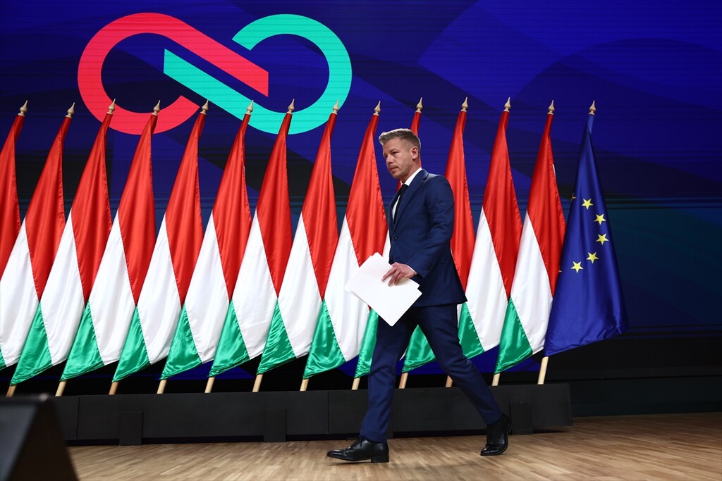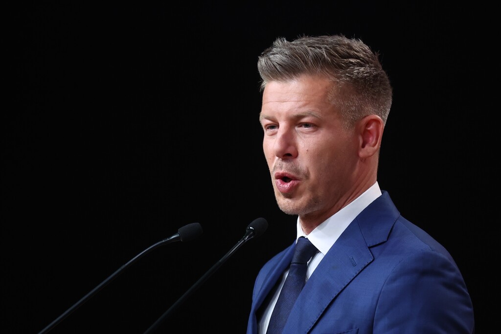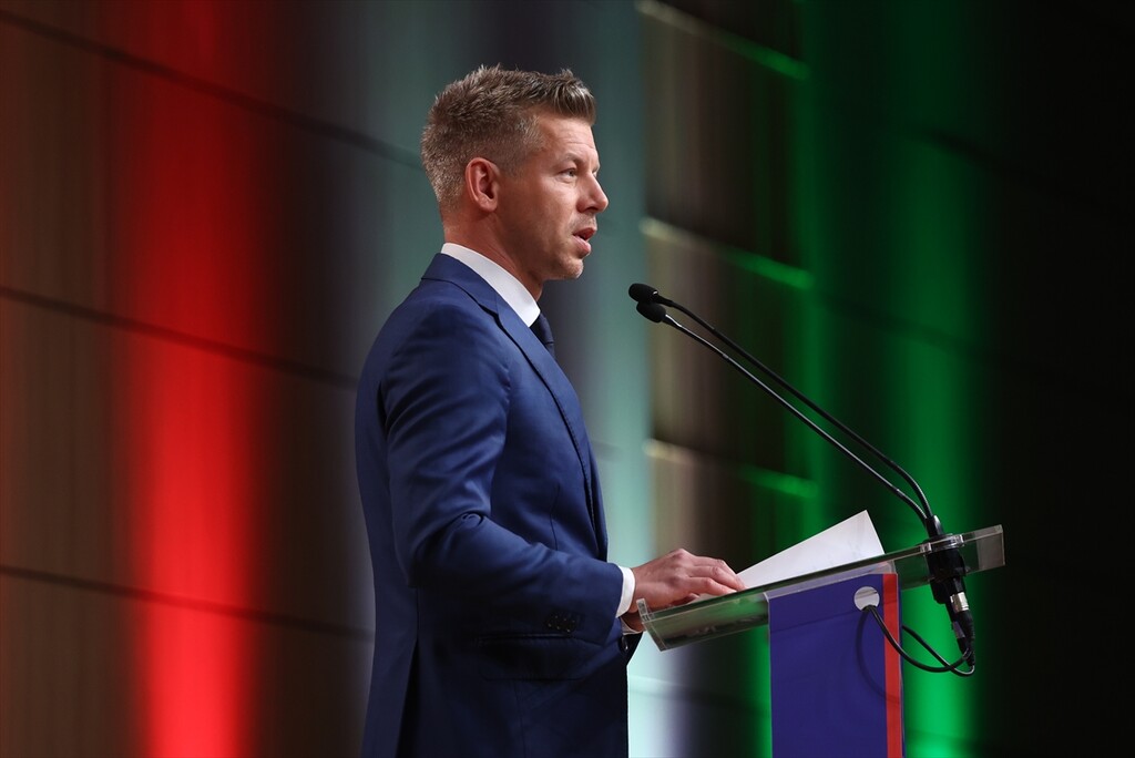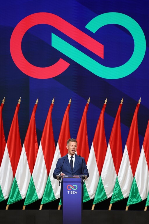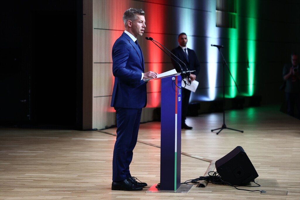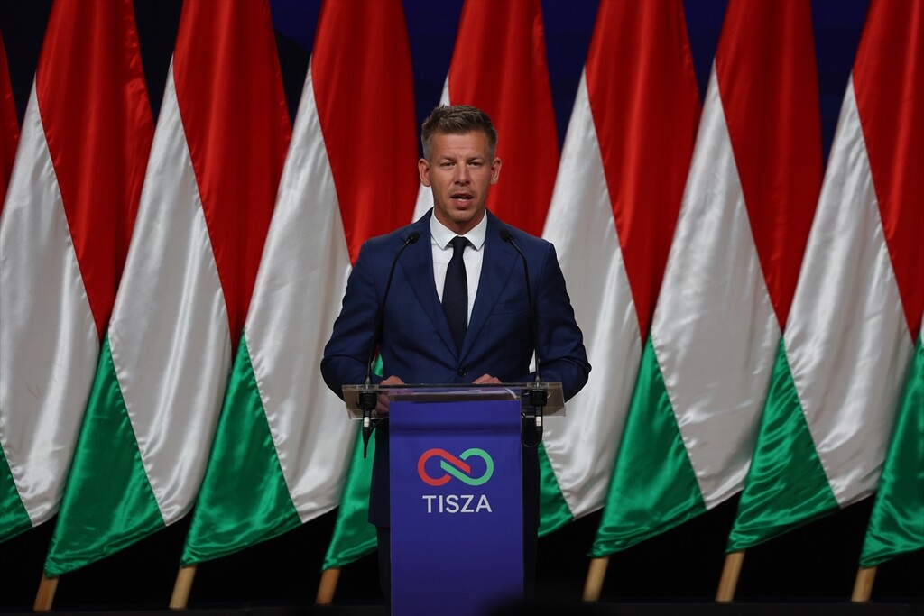 Peter Magyar, leader of the pro-European conservative TISZA party, delivers a speech during a press conference at the HUNGEXPO Congress and Exhibition Center in Budapest, Hungary, on April 13, 2026.