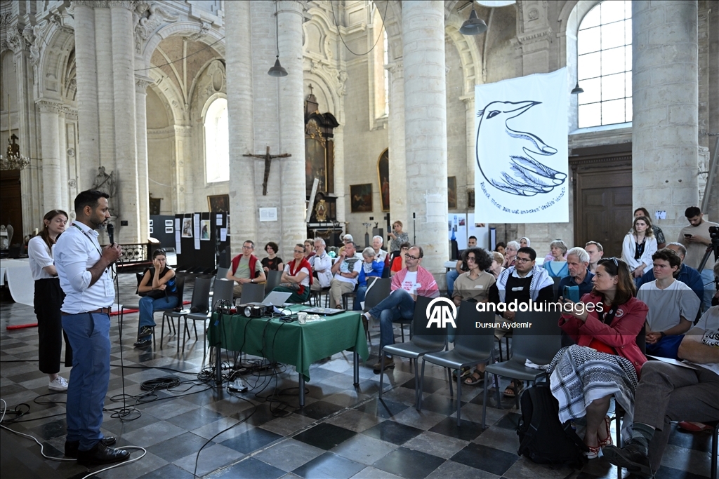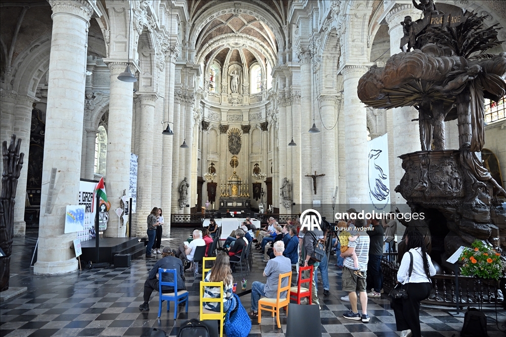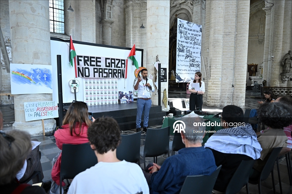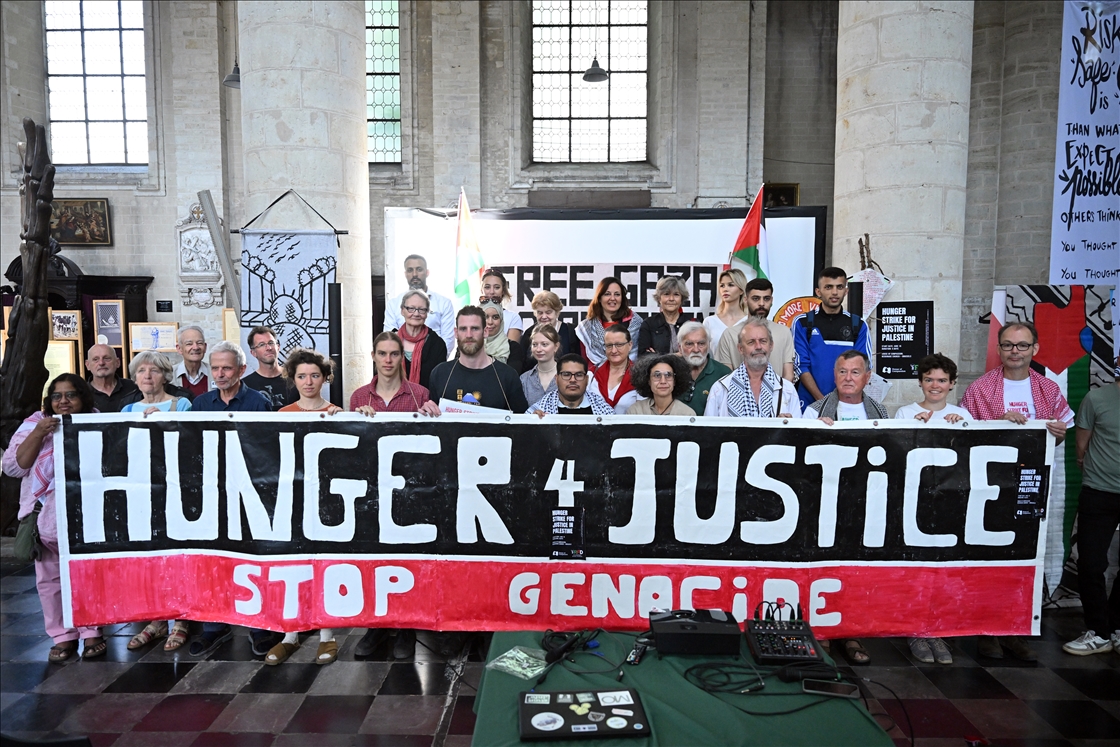 BRUSSELS, BELGIUM - JUNE 16: A group including Priest Daniel Alliet stages a hunger strike for justice in Palestine at the Beguinage Church in central Brussels, Belgium, on June 16, 2025. The protest takes place in the heart of the city that hosts European Union institutions, drawing attention to the ongoing humanitarian situation in Gaza.