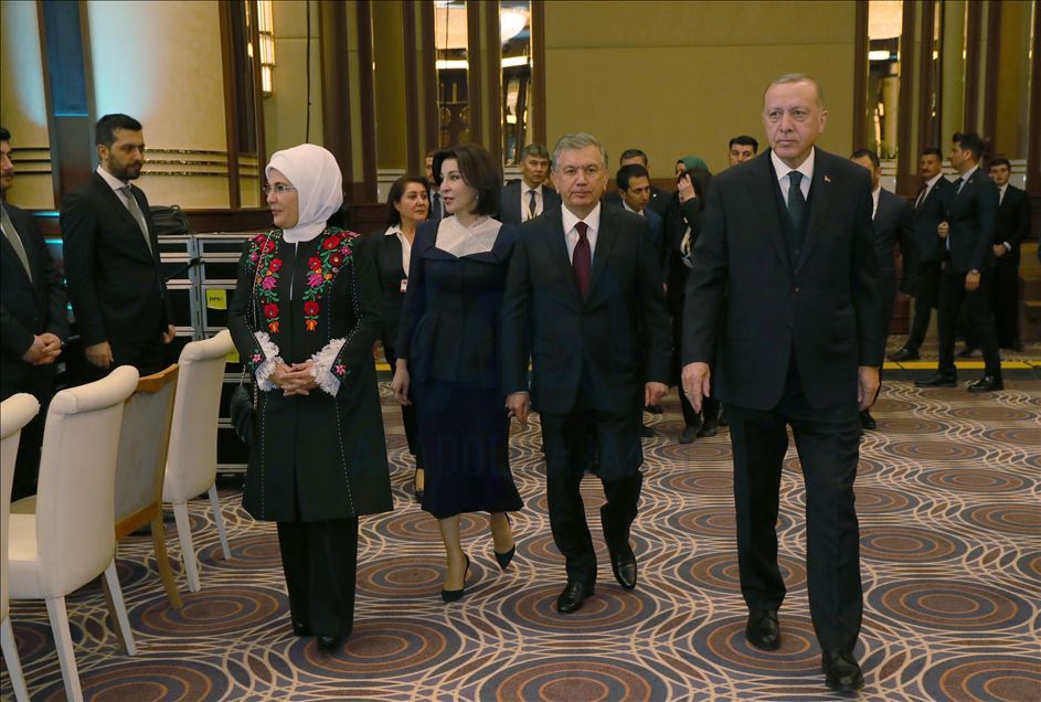 ANKARA, TURKEY - FEBRUARY 20: (----EDITORIAL USE ONLY – MANDATORY CREDIT - "TURKISH PRESIDENCY / MURAT CETINMUHURDAR / HANDOUT" - NO MARKETING NO ADVERTISING CAMPAIGNS - DISTRIBUTED AS A SERVICE TO CLIENTS----) President of Turkey, Recep Tayyip Erdogan (R) and his wife Emine Erdogan (2nd L), President of Uzbekistan, Shavkat Mirziyoyev (2nd R), his wife Ziroatkhon Hoshimova (2nd L), attend inauguration ceremony of landmark Presidential Library in the presidential complex in Ankara, Turkey on February 20, 2020.