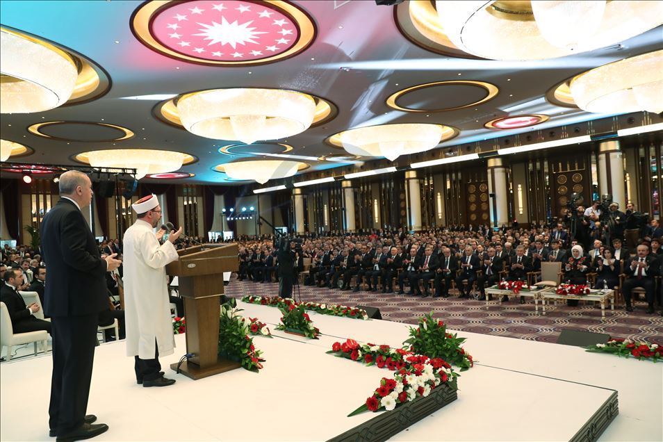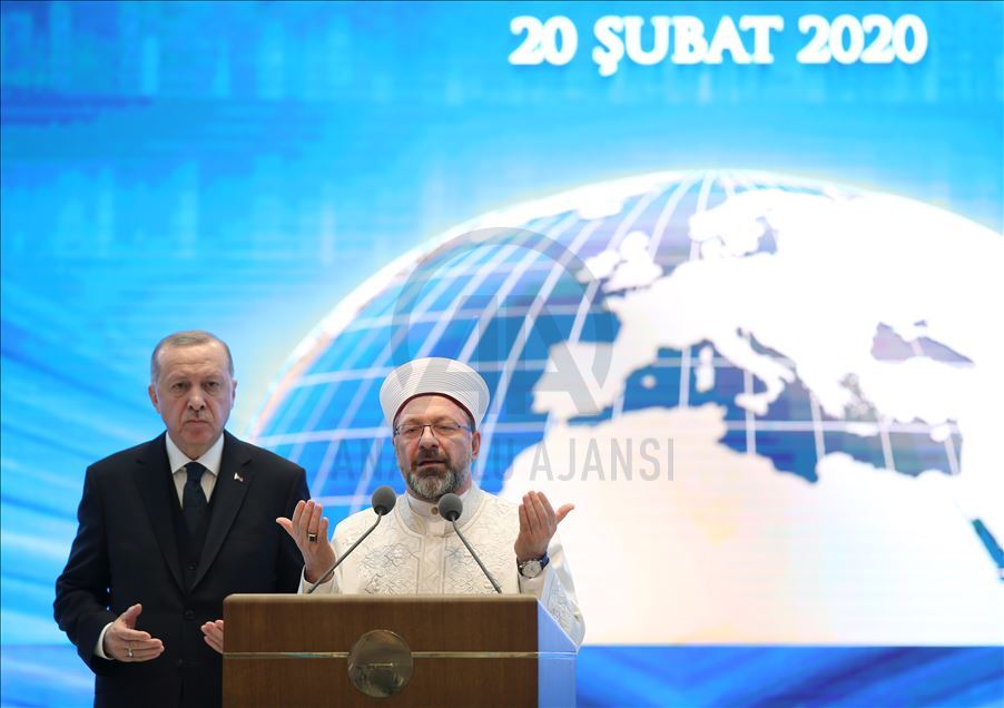 ANKARA, TURKEY - FEBRUARY 20: (----EDITORIAL USE ONLY – MANDATORY CREDIT - "TURKISH PRESIDENCY / MURAT CETINMUHURDAR / HANDOUT" - NO MARKETING NO ADVERTISING CAMPAIGNS - DISTRIBUTED AS A SERVICE TO CLIENTS----) President of Turkey, Recep Tayyip Erdogan and Turkey’s Religious Affairs Directorate, Ali Erbas pray during the inauguration ceremony of landmark Presidential Library in the presidential complex in Ankara, Turkey on February 20, 2020.