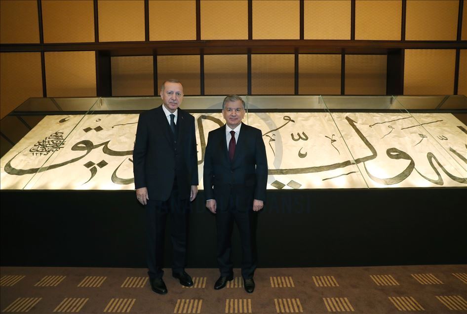 ANKARA, TURKEY - FEBRUARY 20: (----EDITORIAL USE ONLY – MANDATORY CREDIT - "TURKISH PRESIDENCY / MURAT CETINMUHURDAR / HANDOUT" - NO MARKETING NO ADVERTISING CAMPAIGNS - DISTRIBUTED AS A SERVICE TO CLIENTS----) President of Turkey, Recep Tayyip Erdogan (L) and President of Uzbekistan Shavkat Mirziyoyev (L) pose for a photo as they attend the inauguration ceremony of Presidential Library in the presidential complex in Ankara, Turkey on February 20, 2020. ( Turkish Presidency / Murat Cetinmuhurdar / Handout - Anadolu Agency )Turkish Presidency / Murat Cetinmuhurdar / Handout