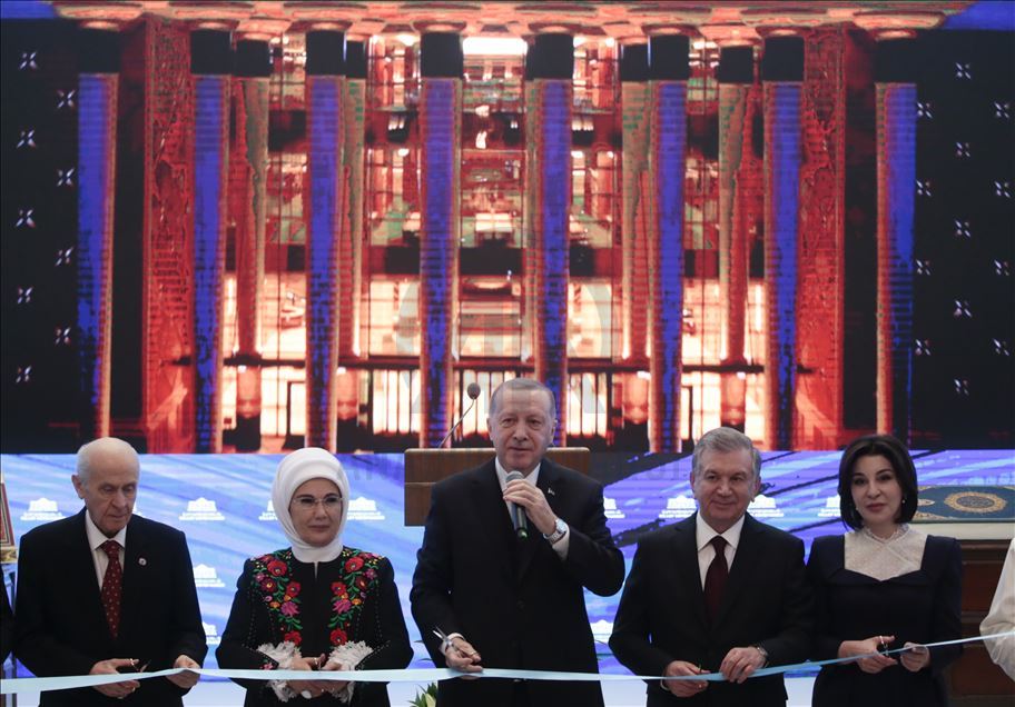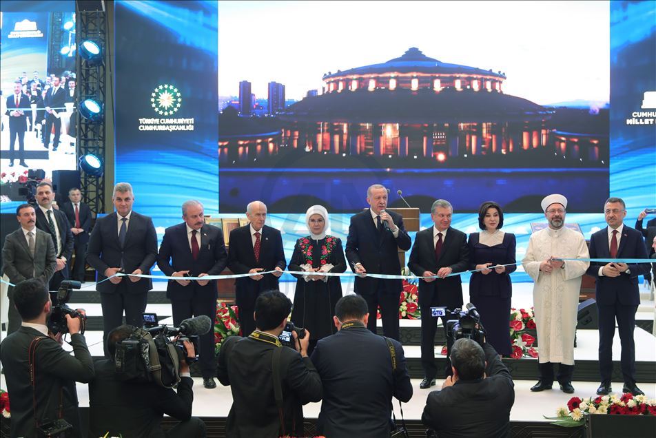 ANKARA, TURKEY - FEBRUARY 20: President of Turkey, Recep Tayyip Erdogan (C), his wife Emine Erdogan (2L), President of Uzbekistan Shavkat Mirziyoyev (R2), his wife Ziroat Mirziyoyeva (R) and Turkey's Nationalist Movement Party's (MHP) Leader, Devlet Bahceli (L) attend the inauguration ceremony of Presidential Library in the presidential complex in Ankara, Turkey on February 20, 2020.