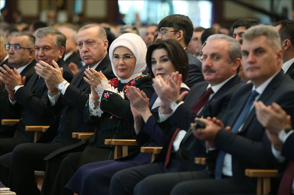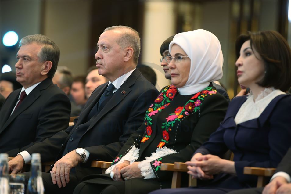 ANKARA, TURKEY - FEBRUARY 20: President of Turkey, Recep Tayyip Erdogan (C) and his wife Emine Erdogan (C-R), President of Uzbekistan, Shavkat Mirziyoyev, and his wife Ziroatkhon Hoshimova attend inauguration ceremony of landmark Presidential Library in the presidential complex in Ankara, Turkey on February 20, 2020.