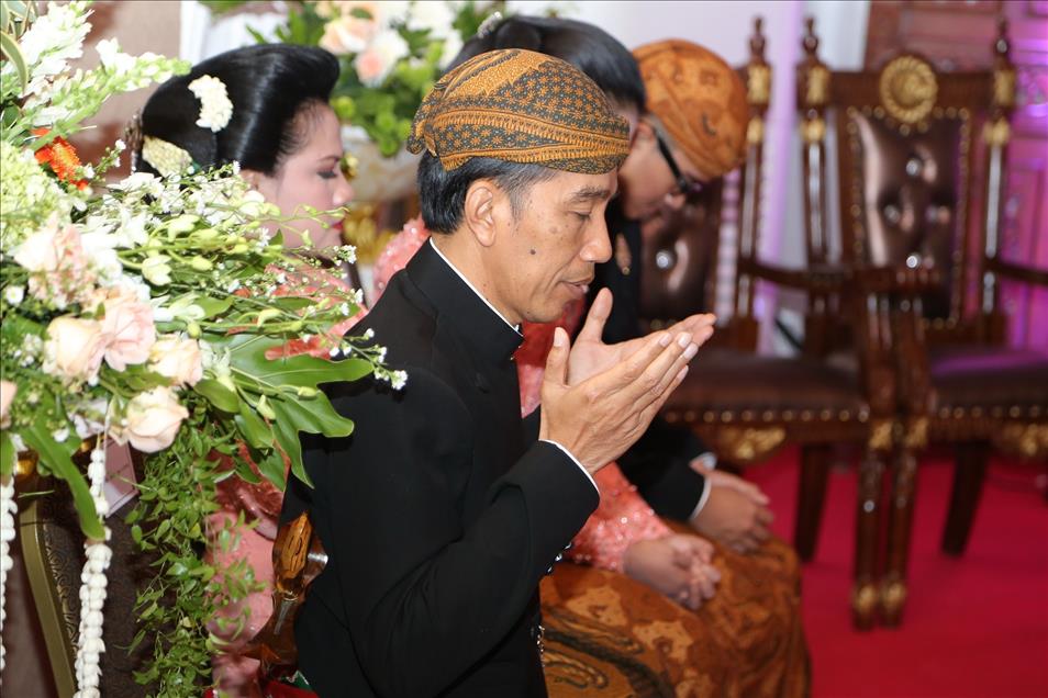 SOLO, INDONESIA - JUNE 11: Indonesian President Joko Widodo is praying during the wedding ceremony of his son Gibran Rakabuming Raka and his bride Selvi Ananda in Solo, Central Java, Indonesia, 11 June 2015. President Joko Widodo's eldest son, Gibran Rakabuming Raka married former winner of a Solo beauty pageant contest Selvi Ananda on 11 June. (Khairul Basyar - Anadolu Agency)Khairul Basyar