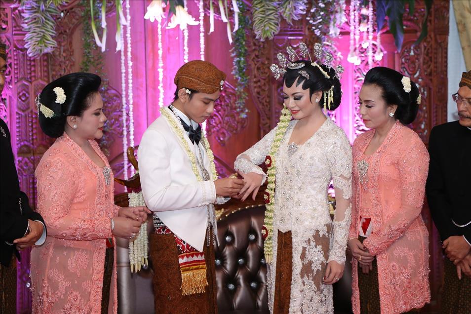 SOLO, INDONESIA - JUNE 11: Indonesian President Joko Widodo's son Gibran Rakabuming Raka (R) and his bride Selvi Ananda are seen during their wedding in Solo, Central Java, Indonesia, 11 June 2015. President Joko Widodo's eldest son, Gibran Rakabuming Raka married former winner of a Solo beauty pageant contest Selvi Ananda on 11 June. (Khairul Basyar - Anadolu Agency)Khairul Basyar