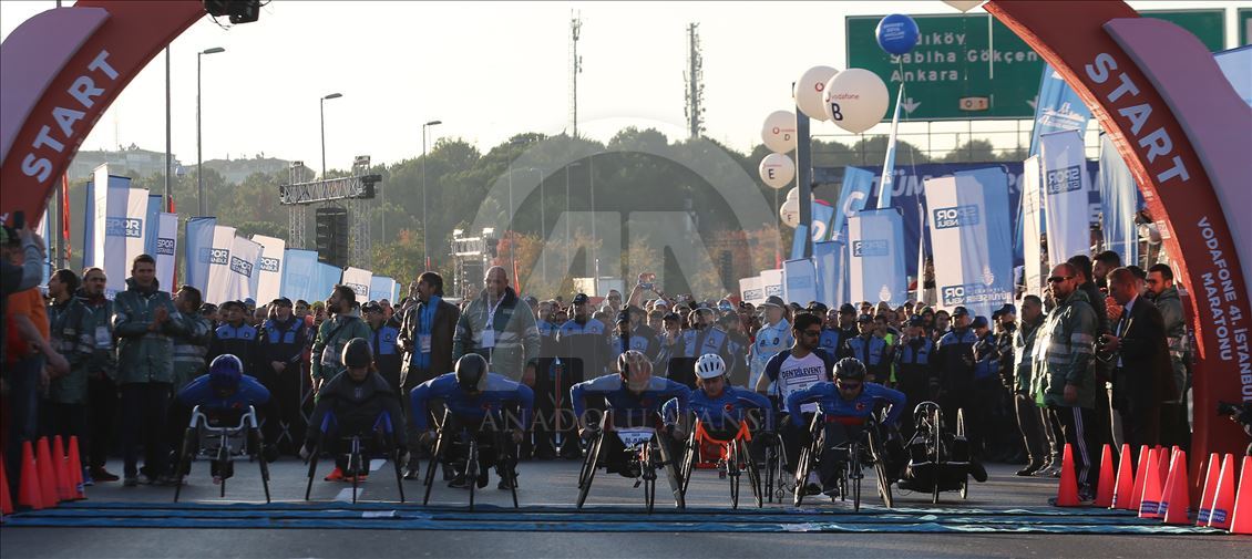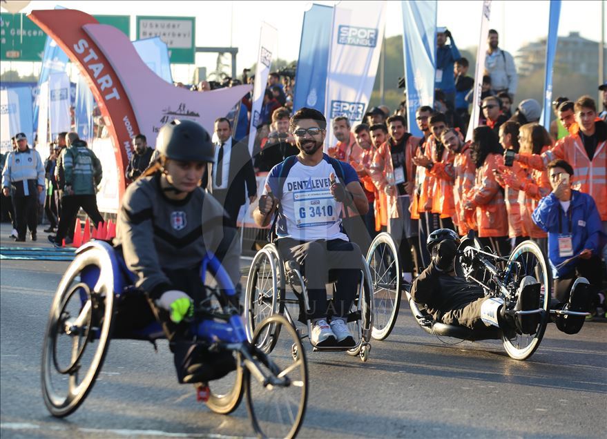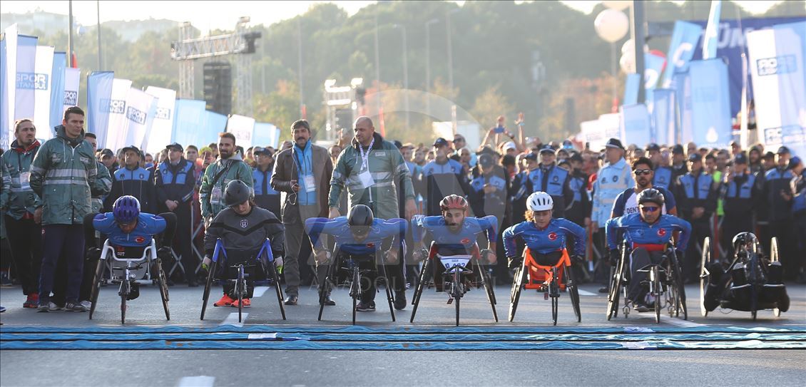 ISTANBUL, TURKEY - NOVEMBER 03: Participants start to compete in wheelchair category within the Vodafone 41th Istanbul Marathon, the world's only intercontinental marathon, that held by Spor Istanbul, a subsidiary of Istanbul Metropolitan Municipality in Istanbul, Turkey on November 03, 2019. ( Esra Bilgin - Anadolu Agency )Esra Bilgin