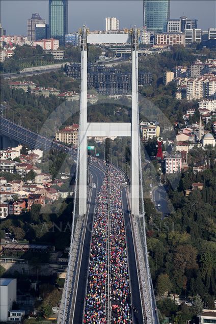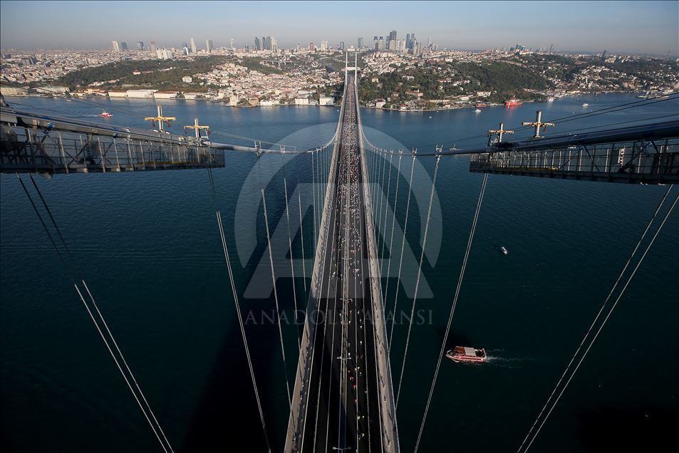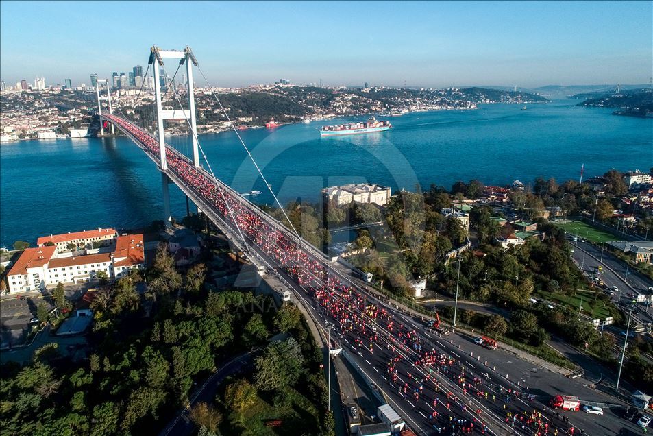 ISTANBUL, TURKEY - NOVEMBER 03: An aerial view of participants compete in the world's only intercontinental marathon 'Vodafone 41st Istanbul Marathon' in Istanbul, Turkey on November 03, 2019.