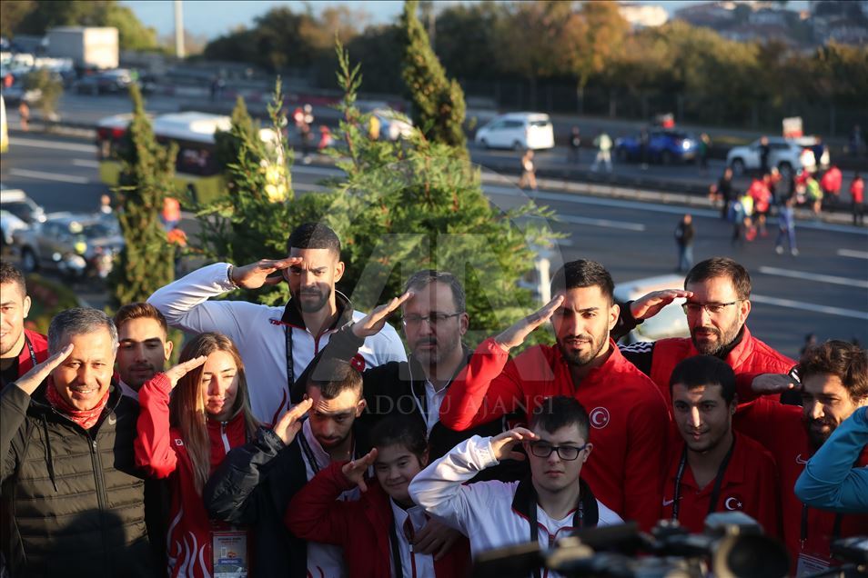 ISTANBUL, TURKEY - NOVEMBER 03: Turkish Youth and Sports Minister Mehmet Muharrem Kasapoglu (C) makes soldier salute with national athletes as he visits "July 15 Martyrs' Memorial" ahead of the world's only intercontinental marathon 'Vodafone 41st Istanbul Marathon' in Istanbul, Turkey on November 03, 2019.