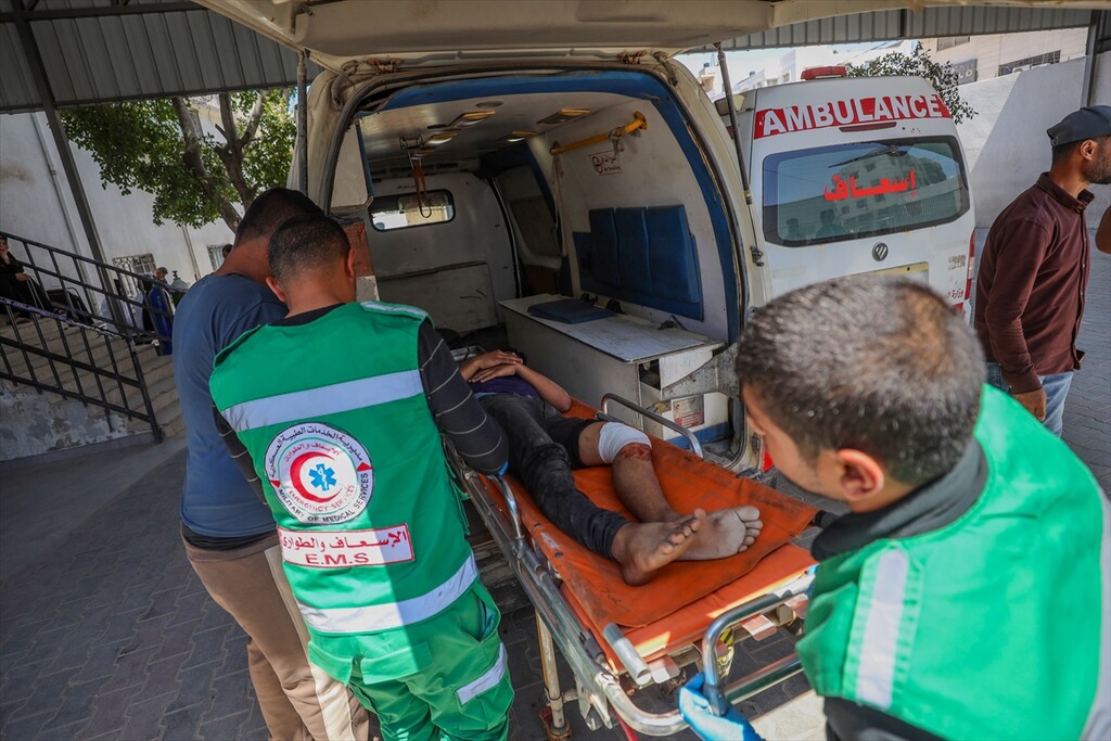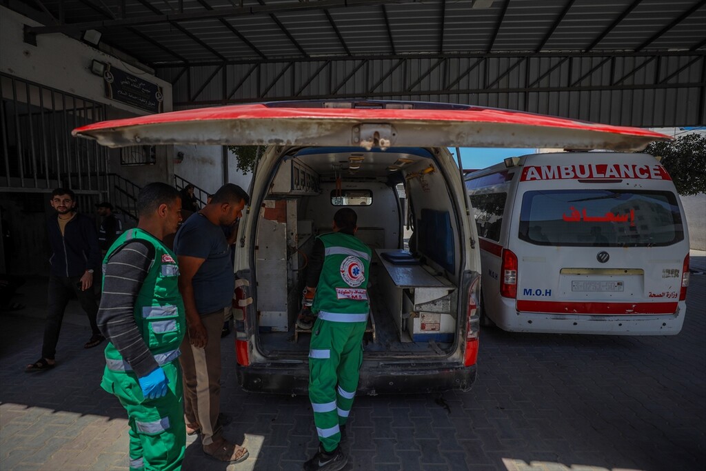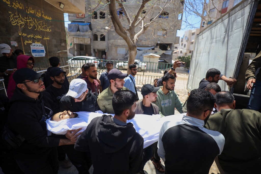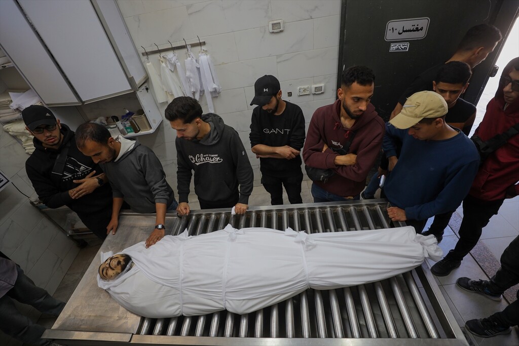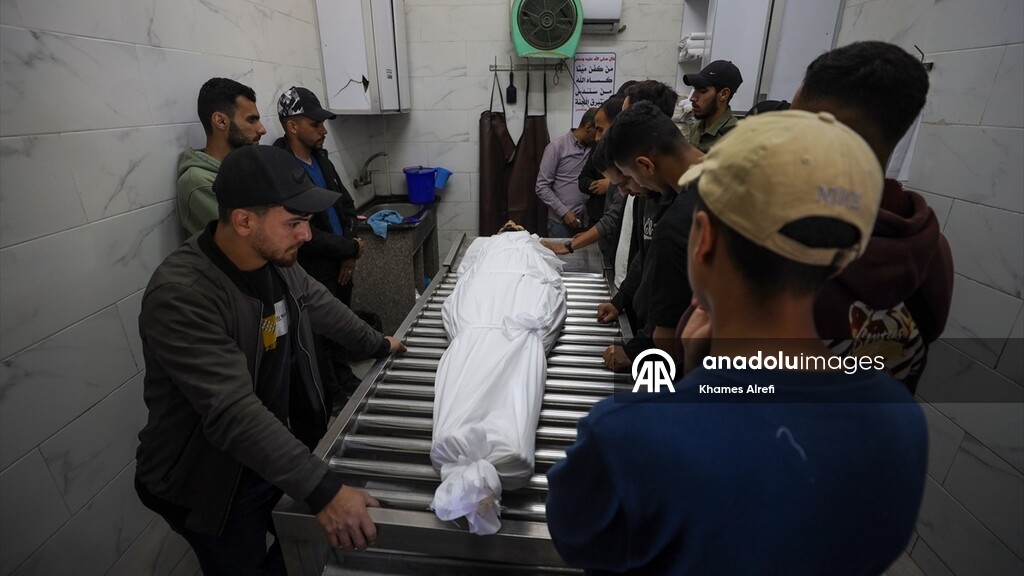 Relatives of the deceased mourn at Al-Shifa Hospital after a Palestinian man was killed when an Israeli military drone targeted workers preparing a water well for the Gaza Municipality in the Zeitoun neighborhood in Gaza City, Gaza, Palestine.