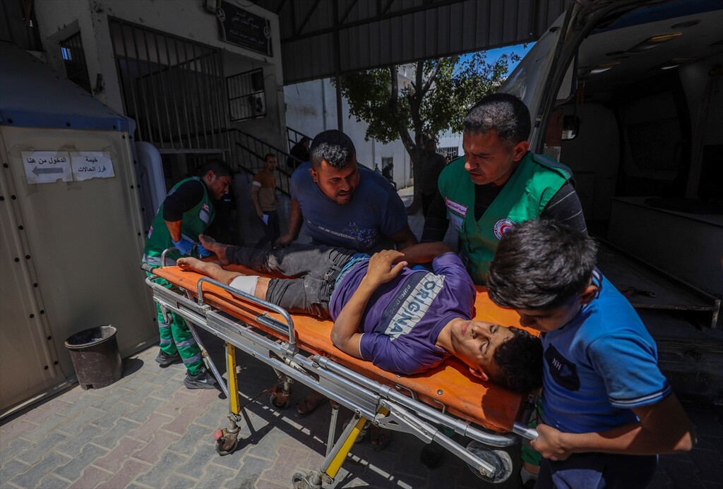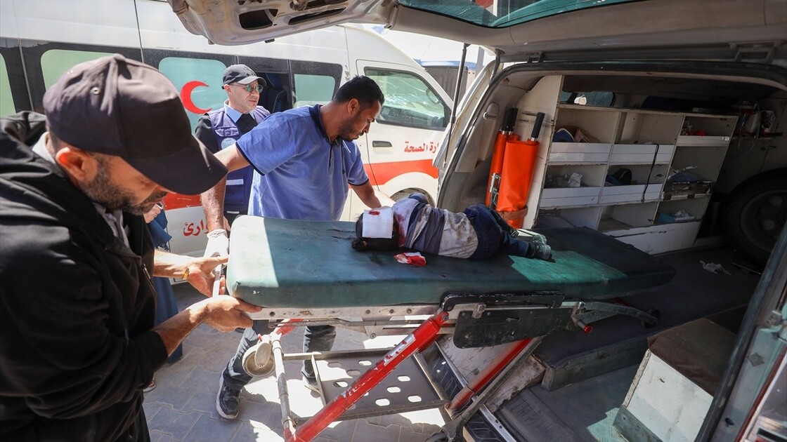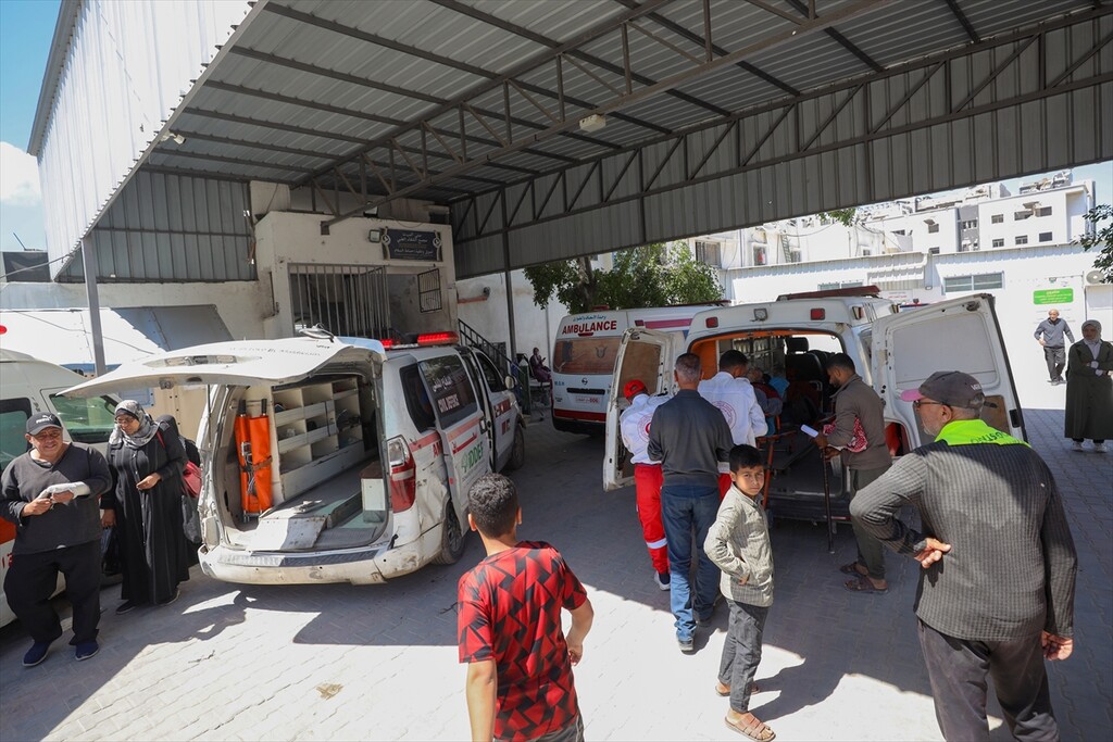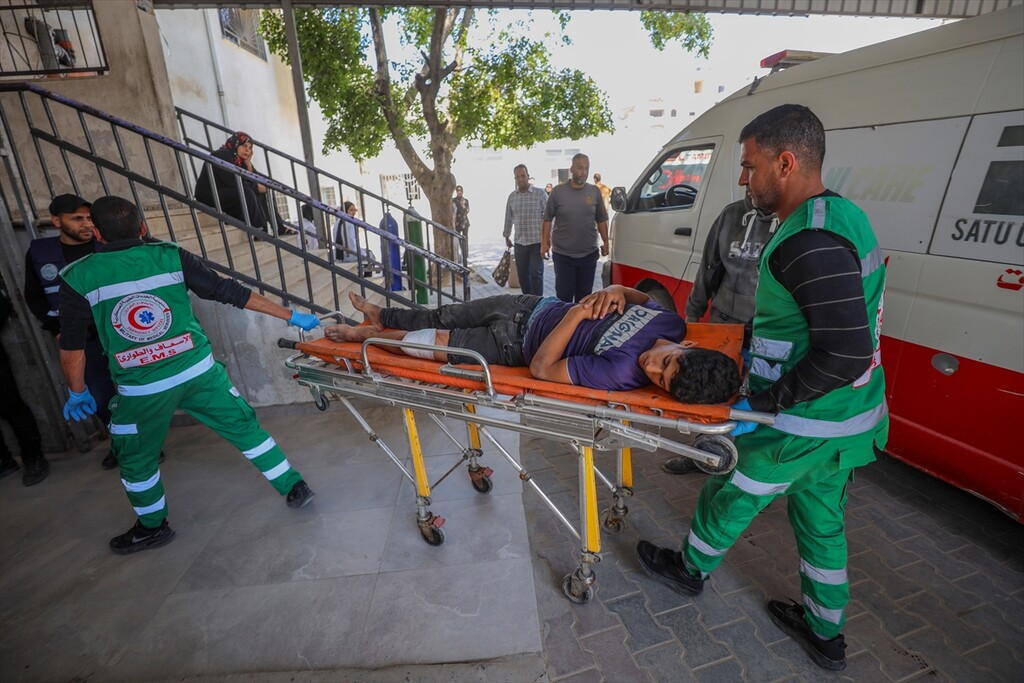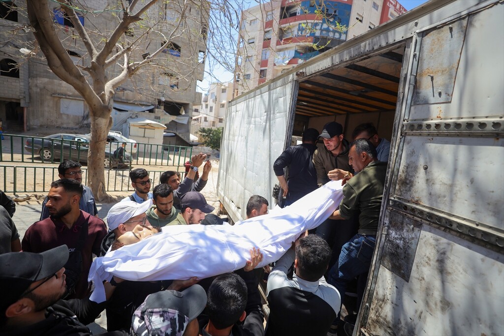 Relatives of the deceased mourn at Al-Shifa Hospital after a Palestinian man was killed when an Israeli military drone targeted workers preparing a water well for the Gaza Municipality in the Zeitoun neighborhood in Gaza City, Gaza, Palestine.