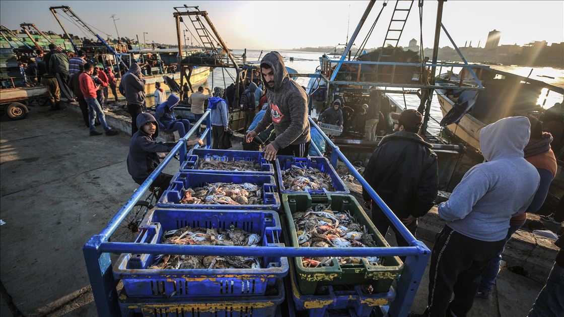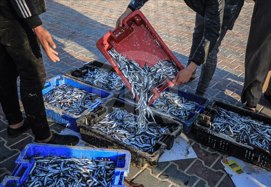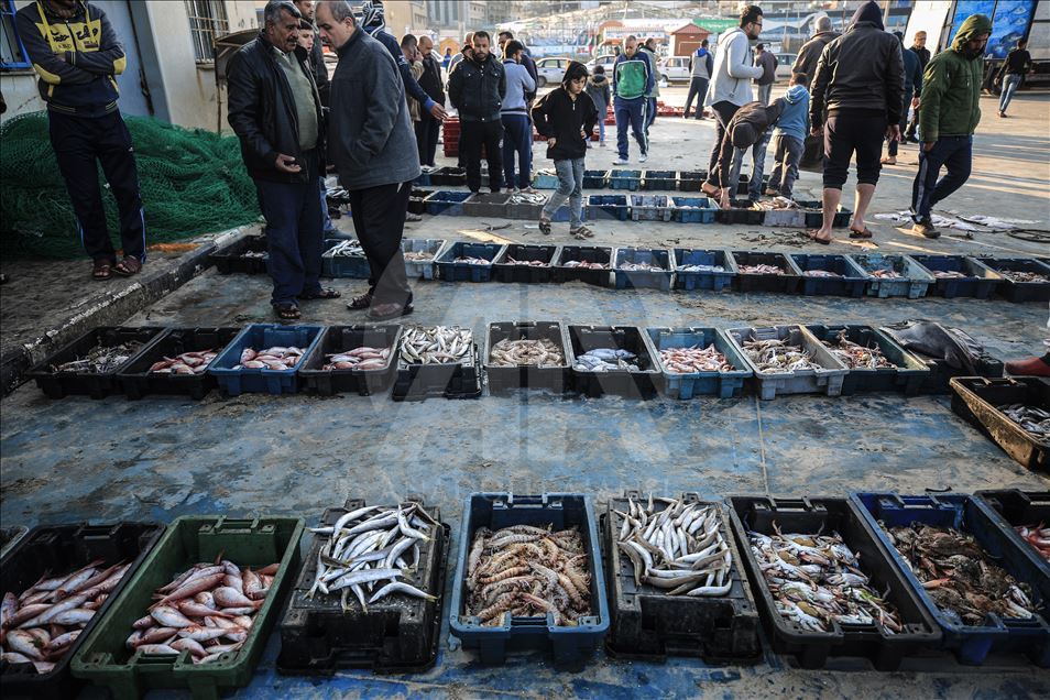GAZA CITY, GAZA - APRIL 3: Palestinian fishermen put fishes on the market at Gaza port after Israel increases fishing zone for Palestinian fishermen off Gaza's coast in Gaza on April 3, 2019.