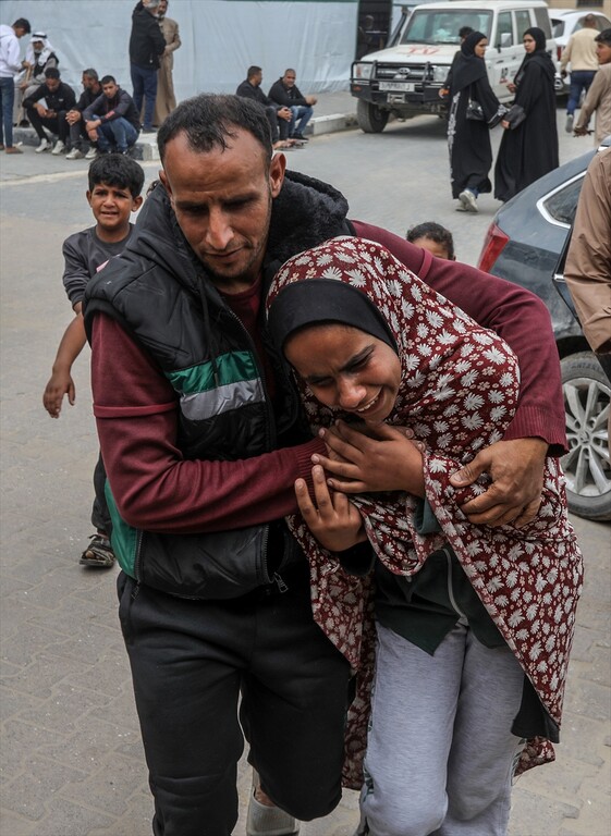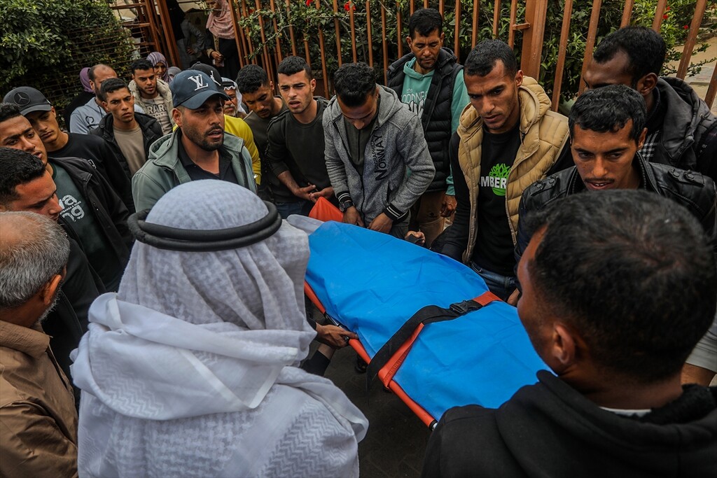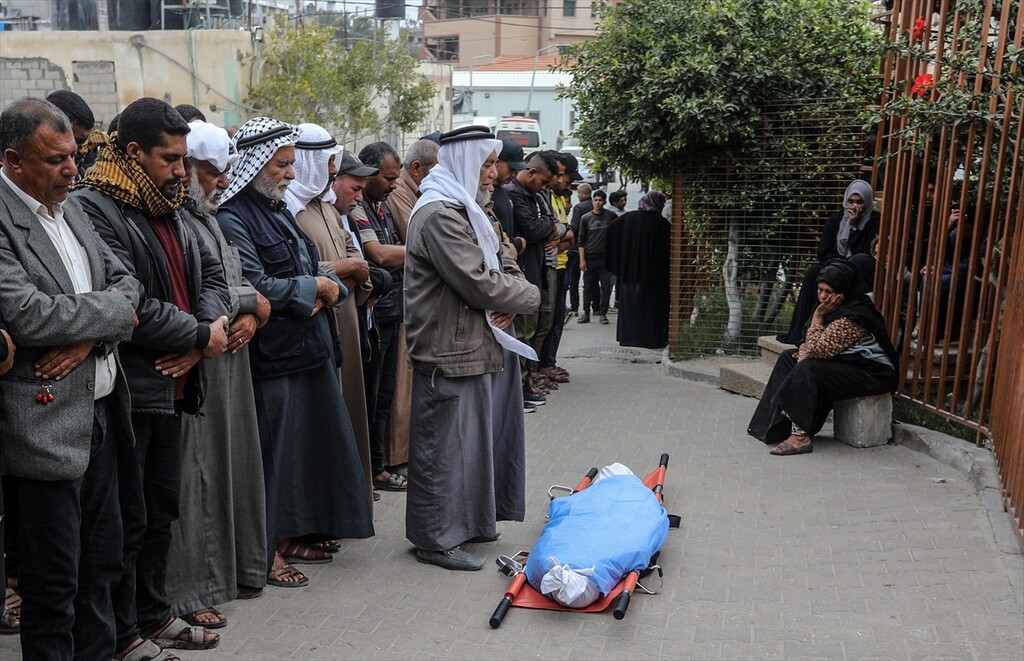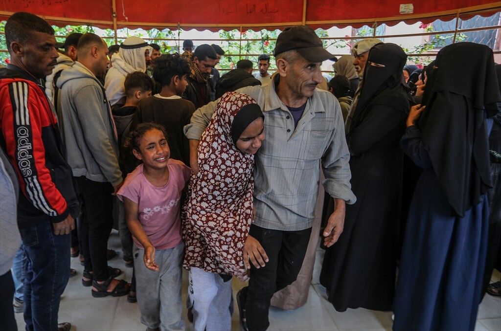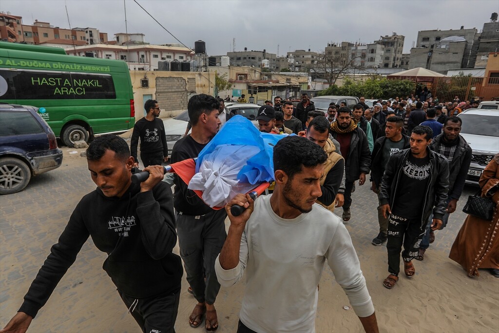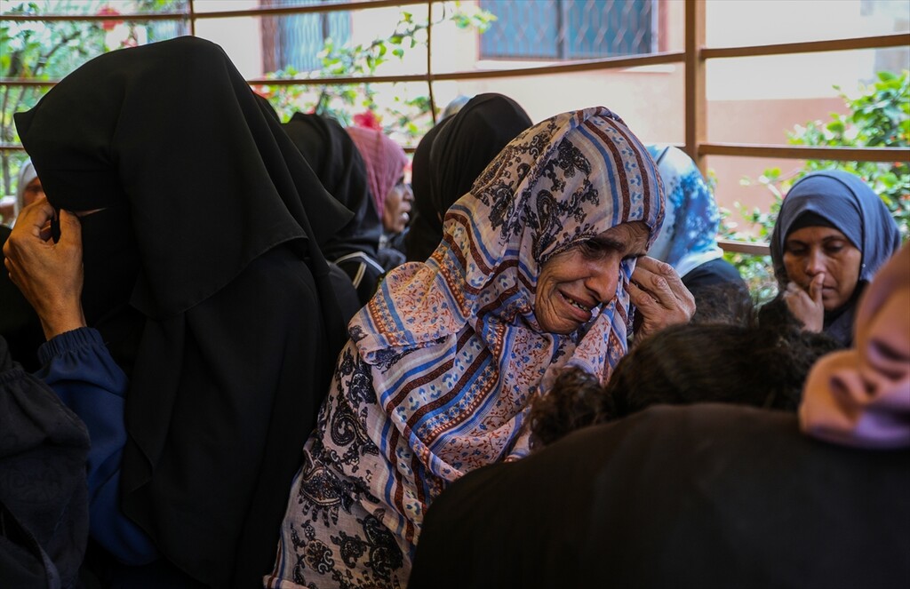 Family members mourn during the funeral of Huda Juma Attar, a 40-year-old mother of five who was killed in an Israeli airstrike despite a ceasefire, after her body was processed at Nasser Hospital in Khan Yunis, Gaza, Palestine, on April 26, 2026.