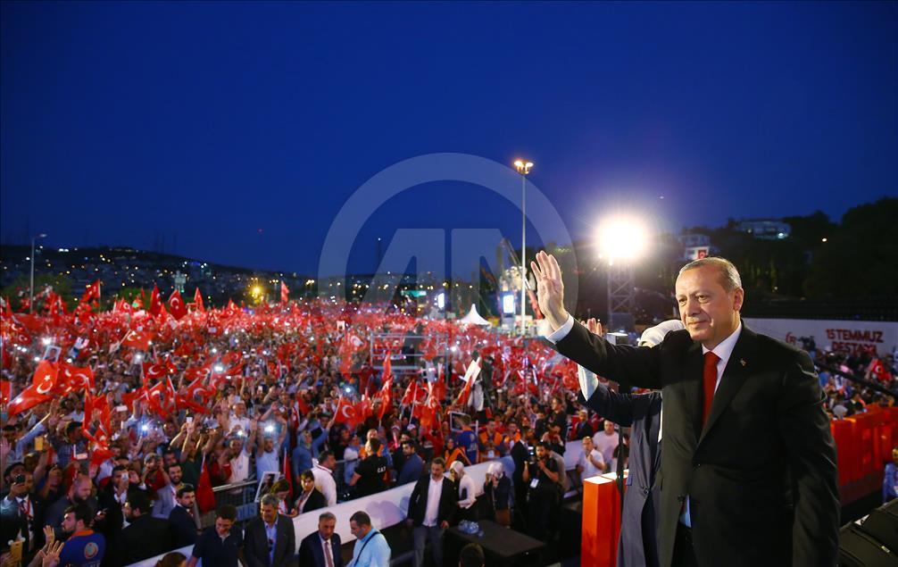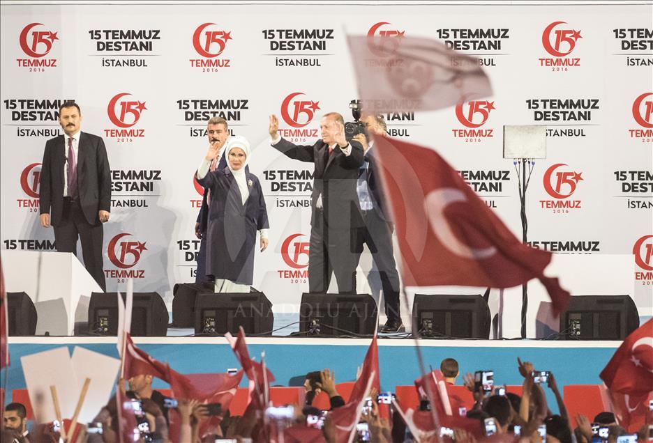 ISTANBUL, TURKEY - JULY 15: President of Turkey, Recep Tayyip Erdogan and his wife Emine Erdogan salute citizen upon their arrival at July 15 Martyrs' Bridge after marching with hundreds of thousands of citizens to attend July 15 Democracy and National Unity Day's events, marking July 15 defeated coup's 1st anniversary in Istanbul, Turkey on July 15, 2017. 249 people were martyred and nearly 2,200 people injured in the defeated 15th of July 2016 coup attempt, which the Turkish government said was carried out by the Fetullah Terrorist Organization (FETO) led by U.S.-based Turkish citizen Fetullah Gulen. ( Salih Zeki Fazlıoğlu - Anadolu Agency )Salih Zeki Fazlıoğlu