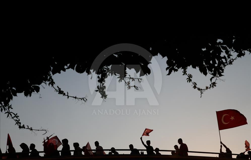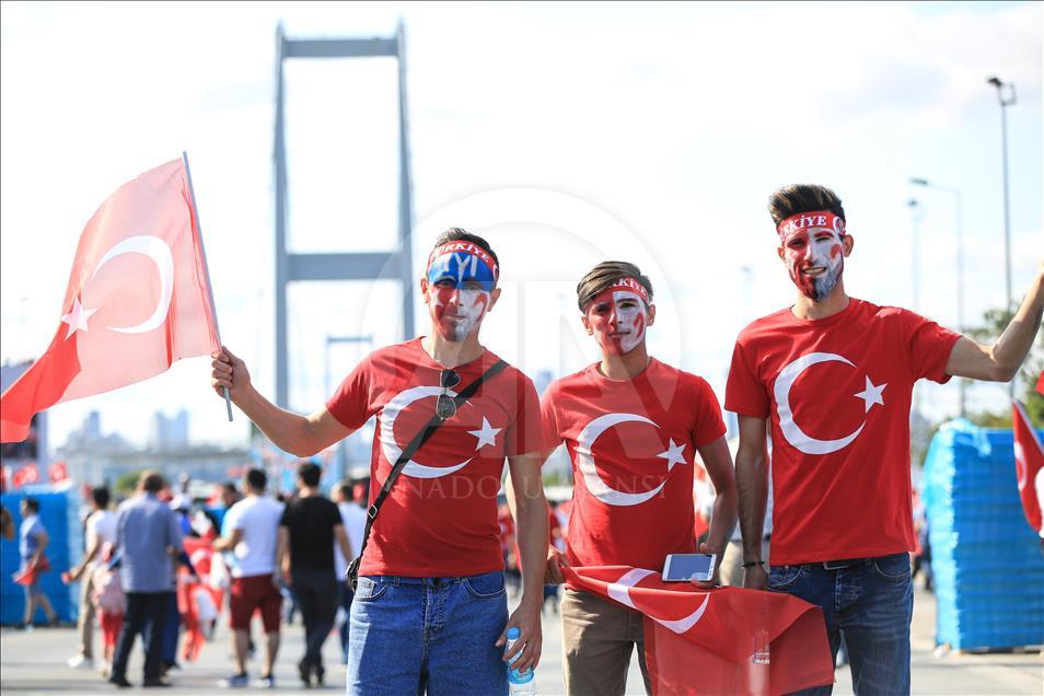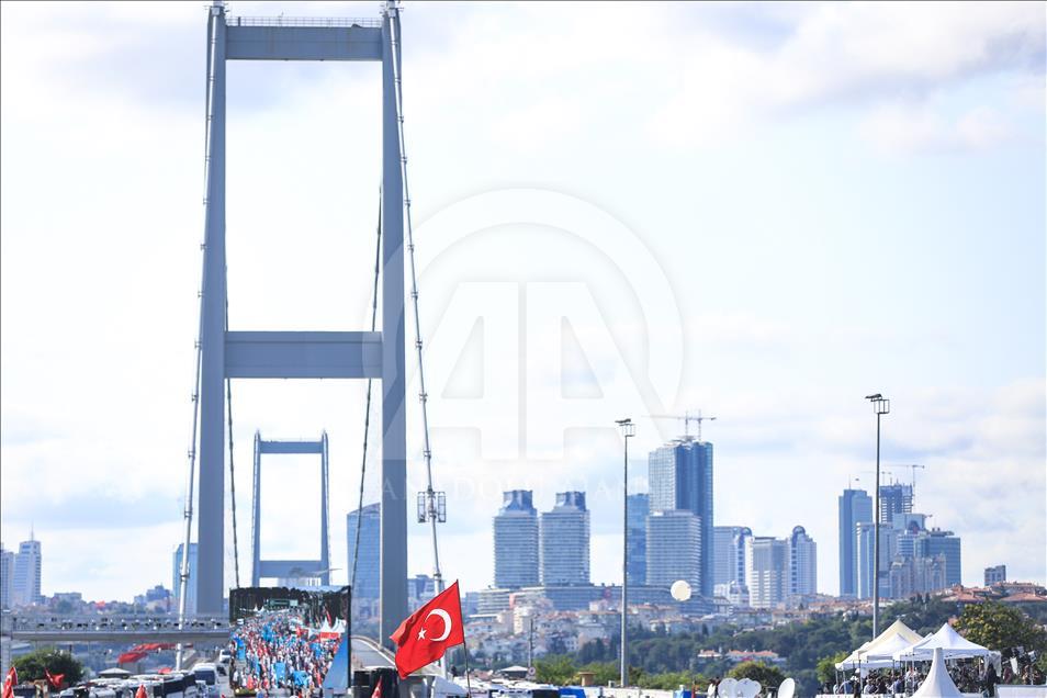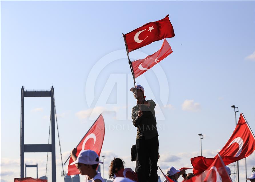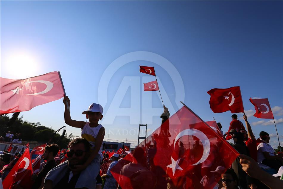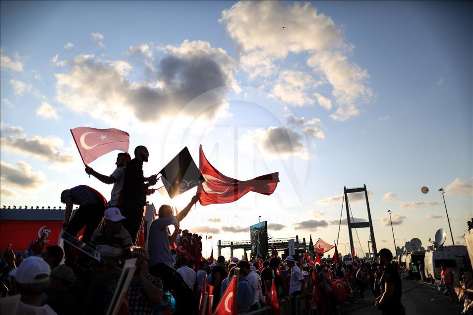 ISTANBUL, TURKEY - JULY 15: People are gather at 15 July Martyrs Bridge during the July 15 Democracy and National Unity Day in Istanbul, Turkey on July 15, 2017. 249 people were martyred and nearly 2,200 people injured in the defeated 15th of July 2016 coup attempt, which the Turkish government said was carried out by the Fetullah Terrorist Organization (FETO) led by U.S.-based Turkish citizen Fetullah Gulen. ( Elif Öztürk - Anadolu Agency )Elif Öztürk