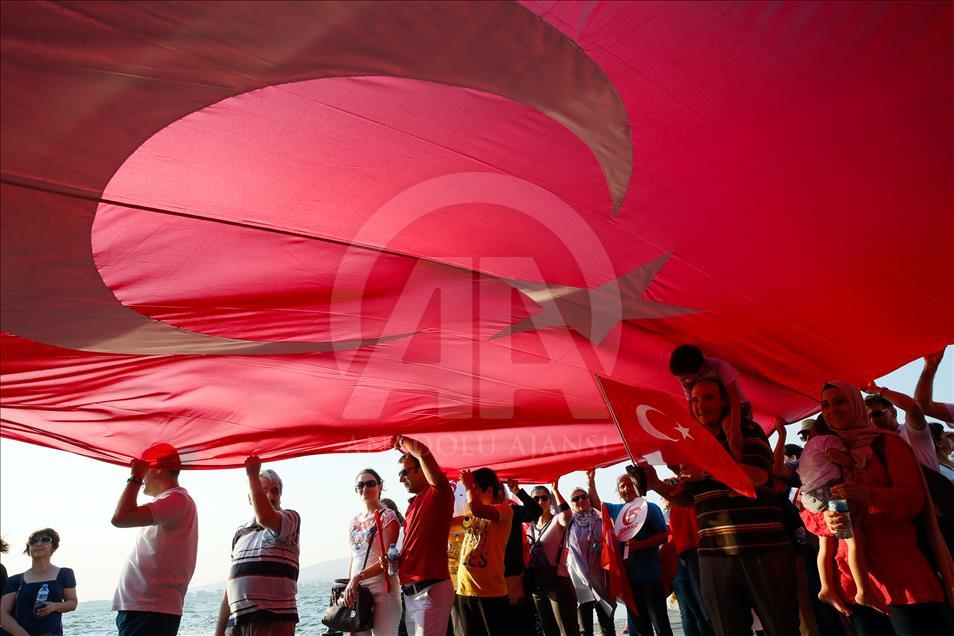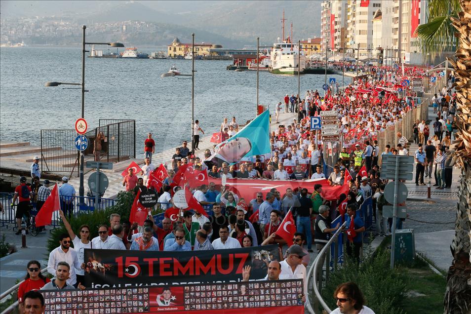 IZMIR,TURKEY - JULY 15 : People walk to Republic Square from Konak Square as they attend July 15 Democracy and National Unity Day's events to mark July 15 defeated coup's 1st anniversary in Izmir, Turkey on July 15, 2017. 249 people were martyred and nearly 2,200 people injured in the defeated 15th of July 2016 coup attempt, which the Turkish government said was carried out by the Fetullah Terrorist Organization (FETO) led by U.S.-based Turkish citizen Fetullah Gulen. ( Evren Atalay - Anadolu Agency )Evren Atalay