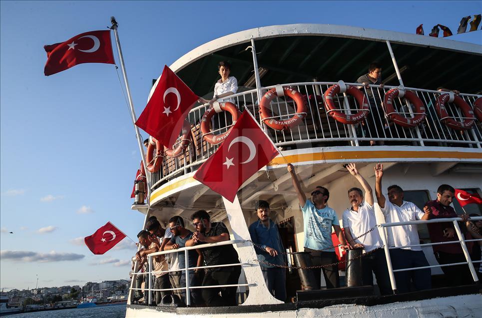 ISTANBUL, TURKEY - JULY 15: People on a ferry trip to July 15 Martyrs' Bridge to attend July 15 Democracy and National Unity Day's events to mark July 15 defeated coup's 1st anniversary at July 15 Martyrs Bridge in Istanbul, Turkey on July 15, 2017. 249 people were martyred and nearly 2,200 people injured in the defeated 15th of July 2016 coup attempt, which the Turkish government said was carried out by the Fetullah Terrorist Organization (FETO) led by U.S.-based Turkish citizen Fetullah Gulen. ( Arif Hüdaverdi Yaman - Anadolu Agency )Arif Hüdaverdi Yaman