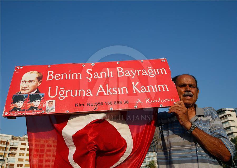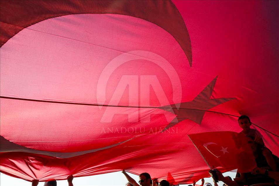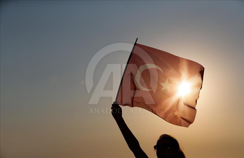 IZMIR,TURKEY - JULY 15 : People wave Turkish flags as they attend July 15 Democracy and National Unity Day's events to mark July 15 defeated coup's 1st anniversary in Izmir, Turkey on July 15, 2017. 249 people were martyred and nearly 2,200 people injured in the defeated 15th of July 2016 coup attempt, which the Turkish government said was carried out by the Fetullah Terrorist Organization (FETO) led by U.S.-based Turkish citizen Fetullah Gulen. ( Evren Atalay - Anadolu Agency )Evren Atalay
