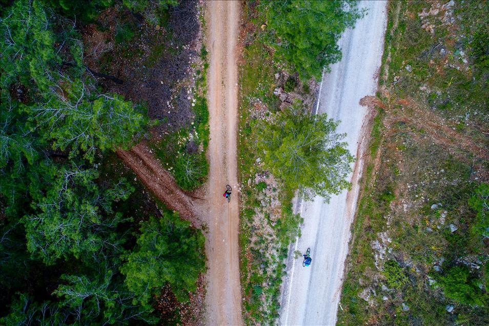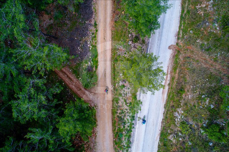 MUGLA, TURKEY - APRIL 11 : An aerial view of a people riding bicycles on the walking route in Mugla, Turkey on April 11, 2018. Karia walking route is an 820-kilometer-long way between Mugla and Aydin provinces, gets its name from ancient Karia civilization that lived in the area. Road has an architecture of its own, bays, olive and almond trees, hills and ancient cities. ( Mustafa Çiftçi - Anadolu Agency )Mustafa Çiftçi