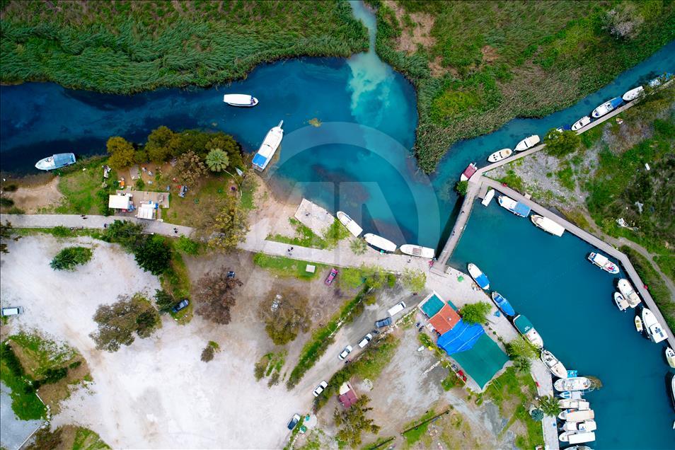 MUGLA, TURKEY - APRIL 11 : An aerial view of a canal between the reeds in Dalyan neighbourhood in Ortaca district of Mugla, Turkey on April 11, 2018. Karia walking route is an 820-kilometer-long way between Mugla and Aydin provinces, gets its name from ancient Karia civilization that lived in the area. Road has an architecture of its own, bays, olive and almond trees, hills and ancient cities. ( Mustafa Çiftçi - Anadolu Agency )Mustafa Çiftçi