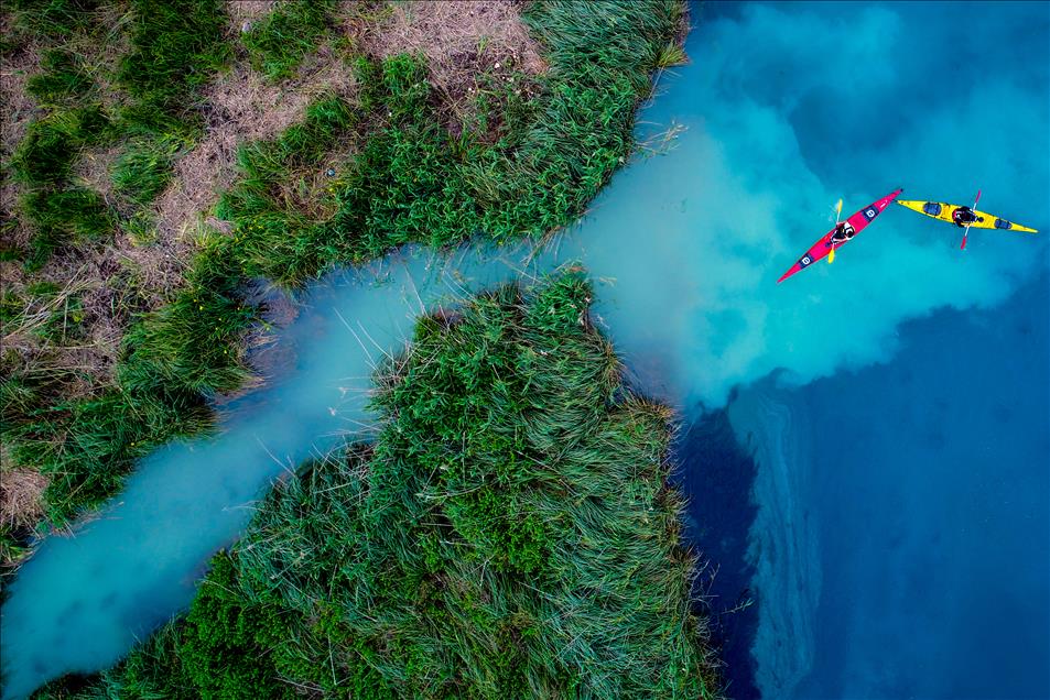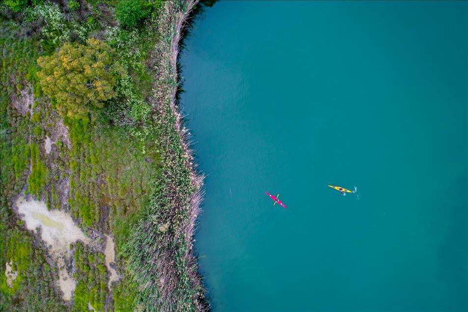 MUGLA, TURKEY - APRIL 11 : An aerial view of a people canoeing on a canal near the reeds in Dalyan neighbourhood in Ortaca district of Mugla, Turkey on April 112018. Karia walking route is an 820-kilometer-long way between Mugla and Aydin provinces, gets its name from ancient Karia civilization that lived in the area. Road has an architecture of its own, bays, olive and almond trees, hills and ancient cities. ( Mustafa Çiftçi - Anadolu Agency )Mustafa Çiftçi