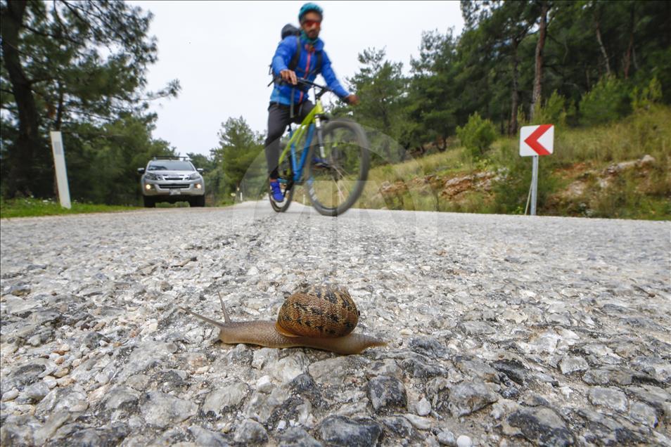 MUGLA, TURKEY - APRIL 11 : A cyclist looks on a snail as a car is seen at the background in Mugla, Turkey on April 11, 2018. Karia walking route is an 820-kilometer-long way between Mugla and Aydin provinces, gets its name from ancient Karia civilization that lived in the area. Road has an architecture of its own, bays, olive and almond trees, hills and ancient cities. ( Mustafa Çiftçi - Anadolu Agency )Mustafa Çiftçi