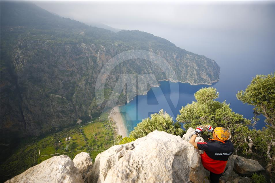 MUGLA, TURKEY - APRIL 12 : An aerial view of Butterfly Valley and its surroundings are seen on the route of Lycian Way in Fethiye district of Mugla, Turkey on April 12, 2018. Lycian way is approximately 540 km long and stretches from Ölüdeniz, near Fethiye, to Geyikbayırı, about 20 kilometers from Antalya. It takes its name from the ancient civilisation, which once ruled the area. ( Mustafa Çiftçi - Anadolu Agency )Mustafa Çiftçi