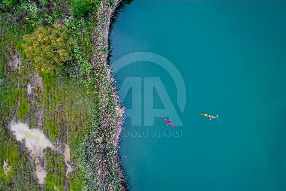 MUGLA, TURKEY - APRIL 11 : An aerial view of a people canoeing on a canal near the reeds in Dalyan neighbourhood in Ortaca district of Mugla, Turkey on April 11, 2018. Karia walking route is an 820-kilometer-long way between Mugla and Aydin provinces, gets its name from ancient Karia civilization that lived in the area. Road has an architecture of its own, bays, olive and almond trees, hills and ancient cities. ( Mustafa Çiftçi - Anadolu Agency )Mustafa Çiftçi