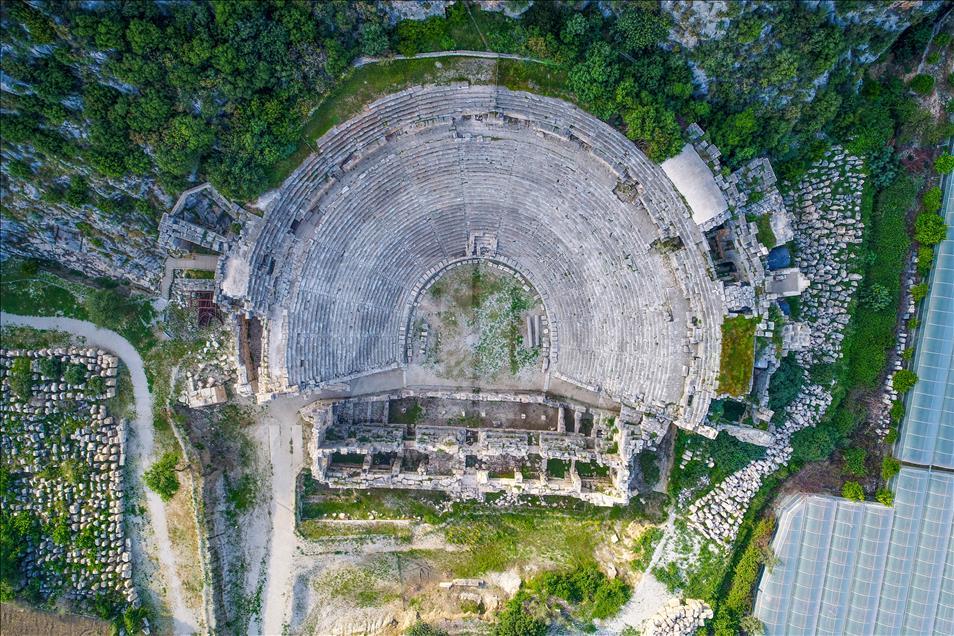 ANTALYA, TURKEY - APRIL 12 : An aerial view of Ancient Site of Letoon, sacred cult center of Lycia, and its surroundings are seen in Antalya, Turkey on April 12, 2018. Lycian way is approximately 540 km long and stretches from Ölüdeniz, near Fethiye, to Geyikbayırı, about 20 kilometers from Antalya. It takes its name from the ancient civilisation, which once ruled the area. ( Mustafa Çiftçi - Anadolu Agency )Mustafa Çiftçi
