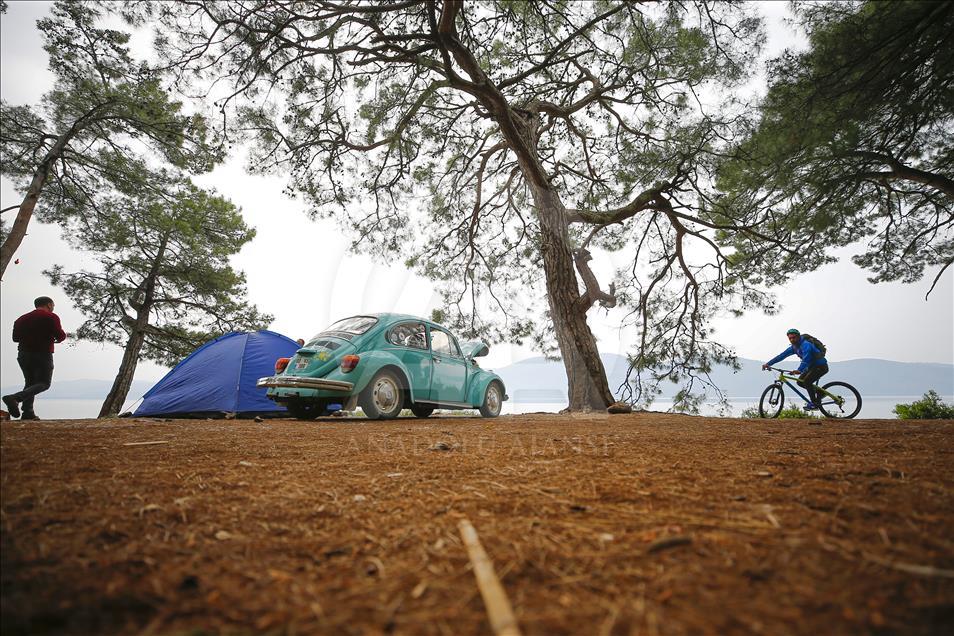 MUGLA, TURKEY - APRIL 11 : A view of a people setting up camp with a tent near Aegean Sea in Ula district of Mugla, Turkey on April 11, 2018. Karia walking route is an 820-kilometer-long way between Mugla and Aydin provinces, gets its name from ancient Karia civilization that lived in the area. Road has an architecture of its own, bays, olive and almond trees, hills and ancient cities. ( Mustafa Çiftçi - Anadolu Agency )Mustafa Çiftçi