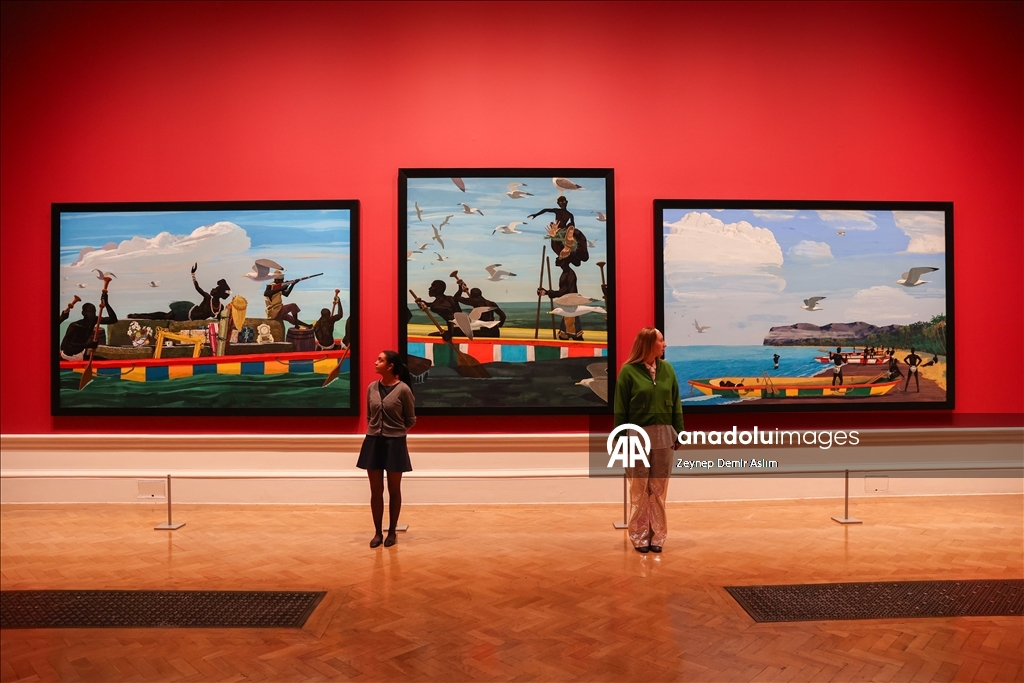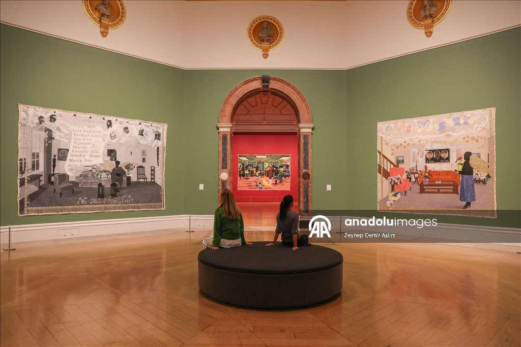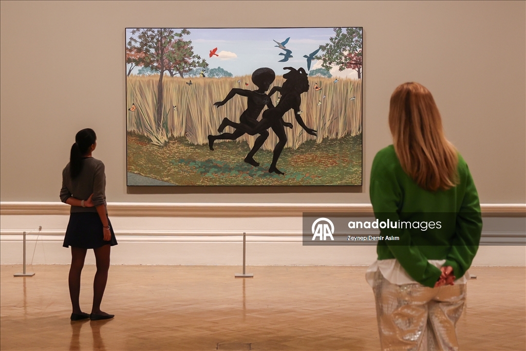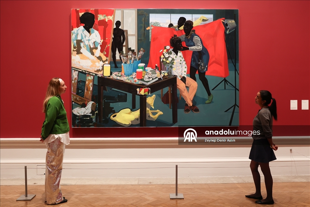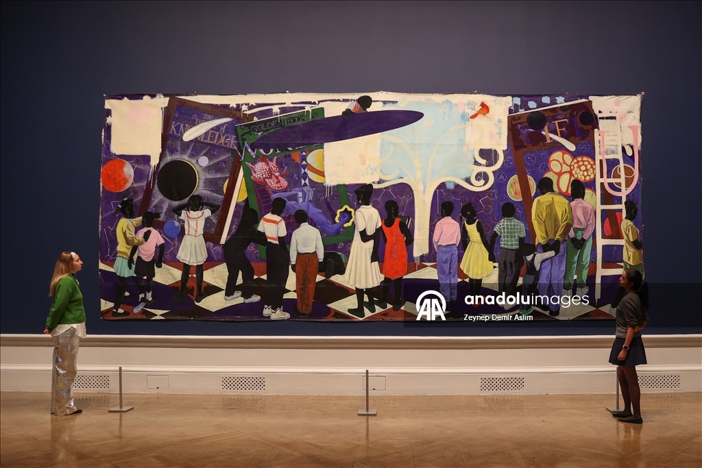 Visitors attend a press preview at the Royal Academy of Arts in London for “The Histories,” a retrospective exhibition dedicated to the 70th birthday of American artist and Honorary Royal Academician Kerry James Marshall in London