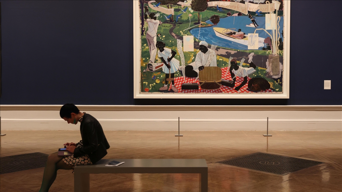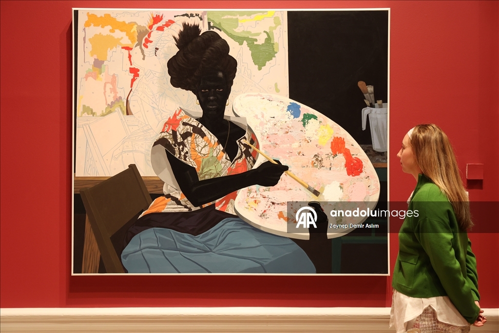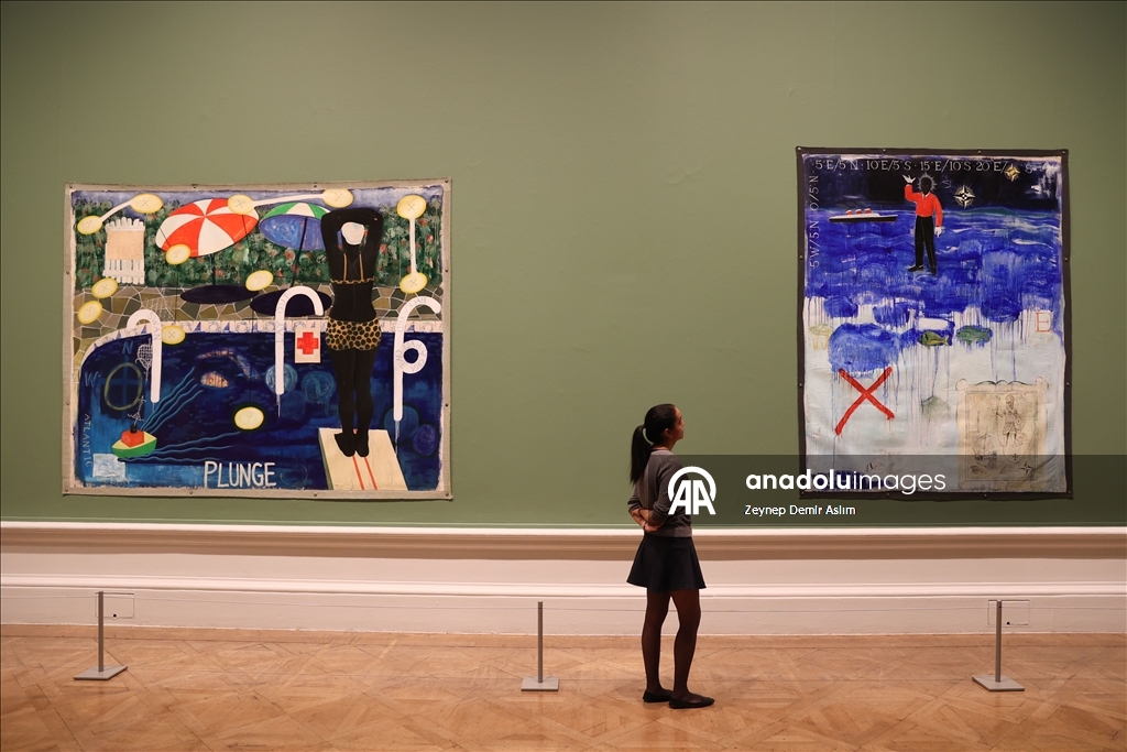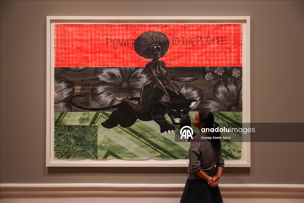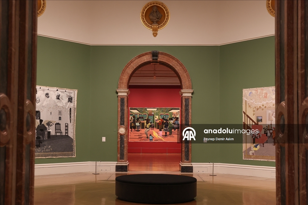 Visitors attend a press preview at the Royal Academy of Arts in London for “The Histories,” a retrospective exhibition dedicated to the 70th birthday of American artist and Honorary Royal Academician Kerry James Marshall in London