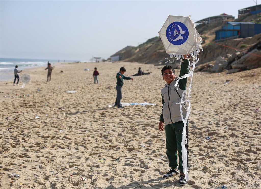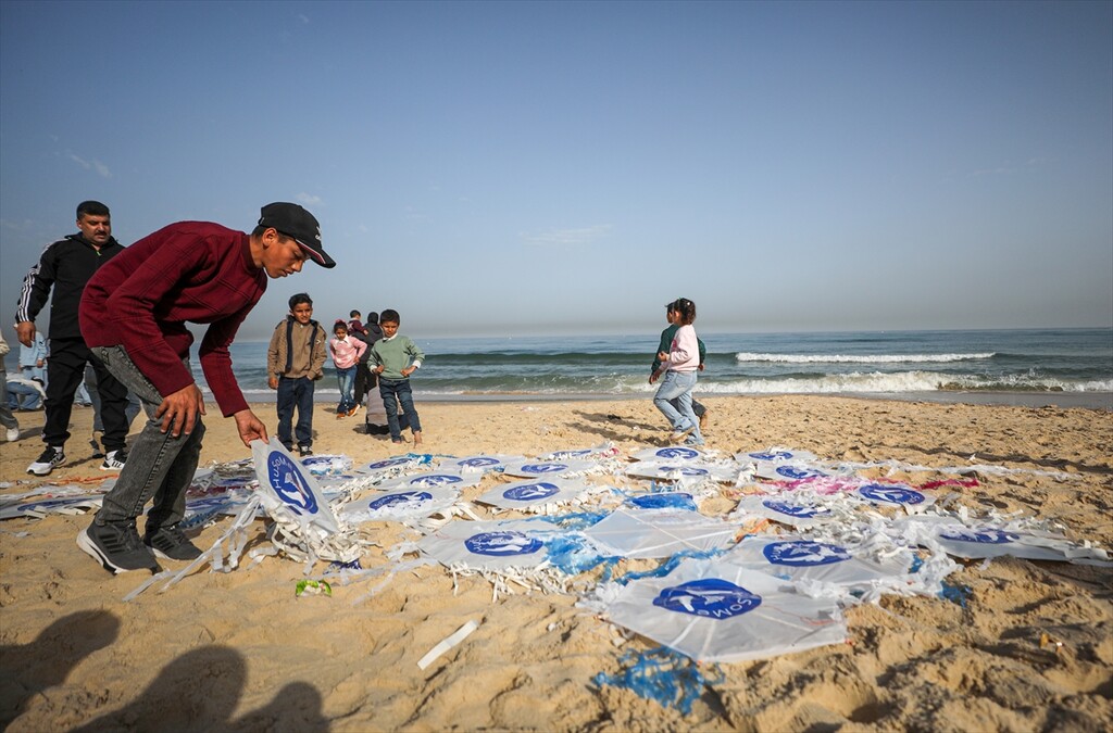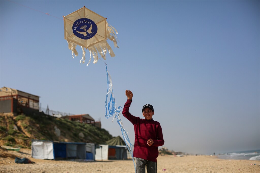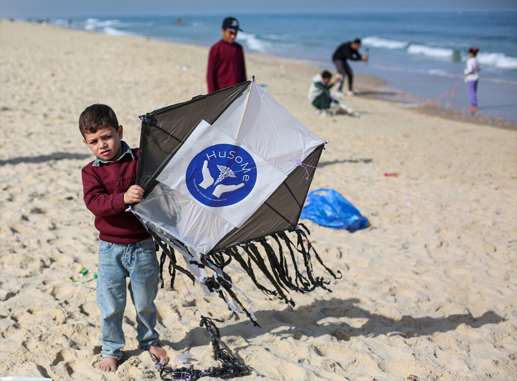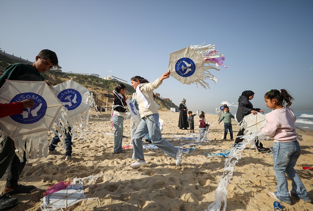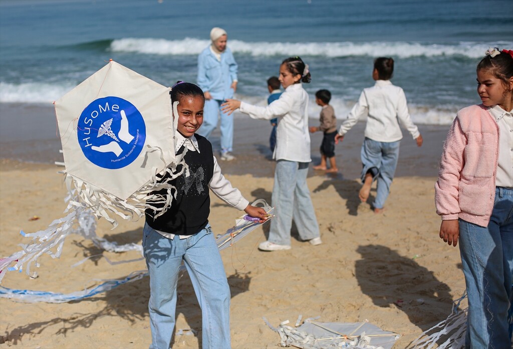 A humanitarian organization holds a kite-flying event on the Nuseirat beach for Palestinian children who lost their families, aiming to ease the psychological impact of ongoing attacks and provide a moment of relief, in Gaza.