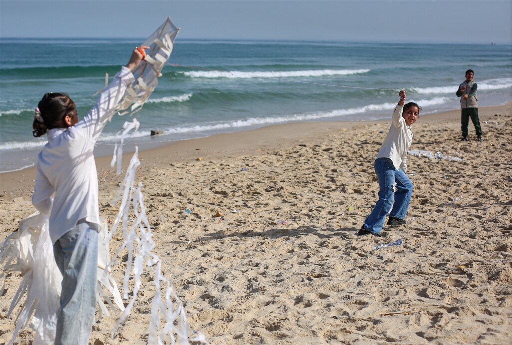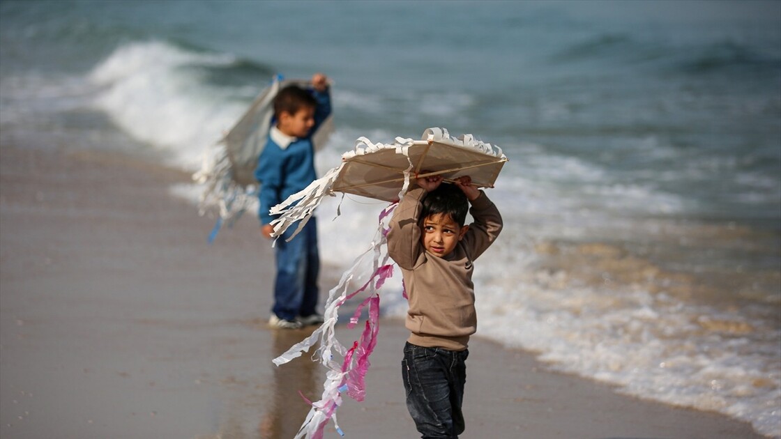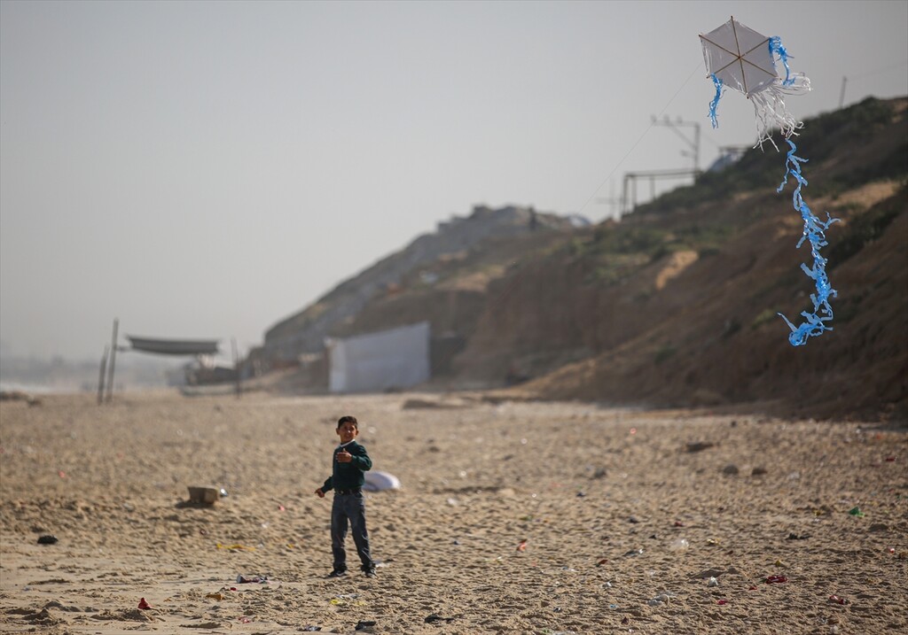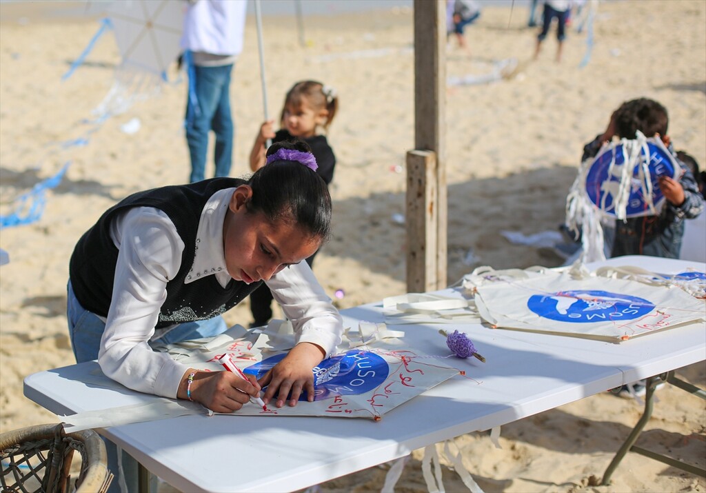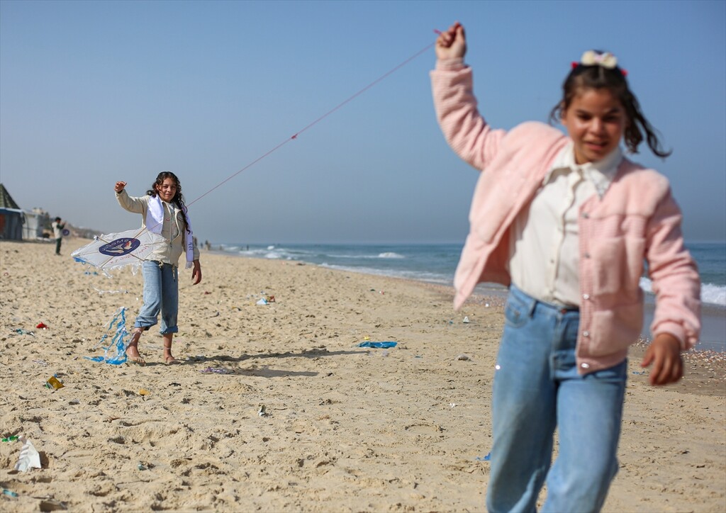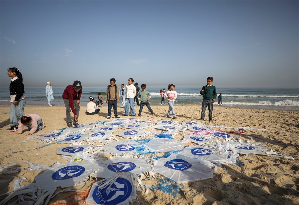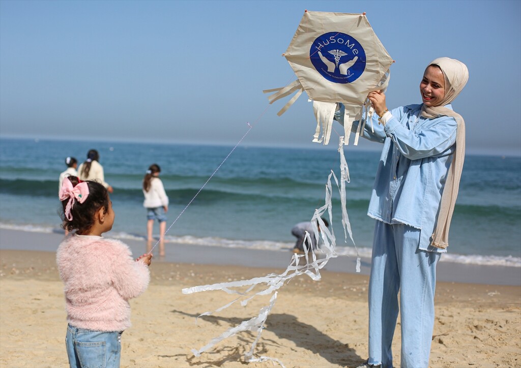 A humanitarian organization holds a kite-flying event on the Nuseirat beach for Palestinian children who lost their families, aiming to ease the psychological impact of ongoing attacks and provide a moment of relief, in Gaza.