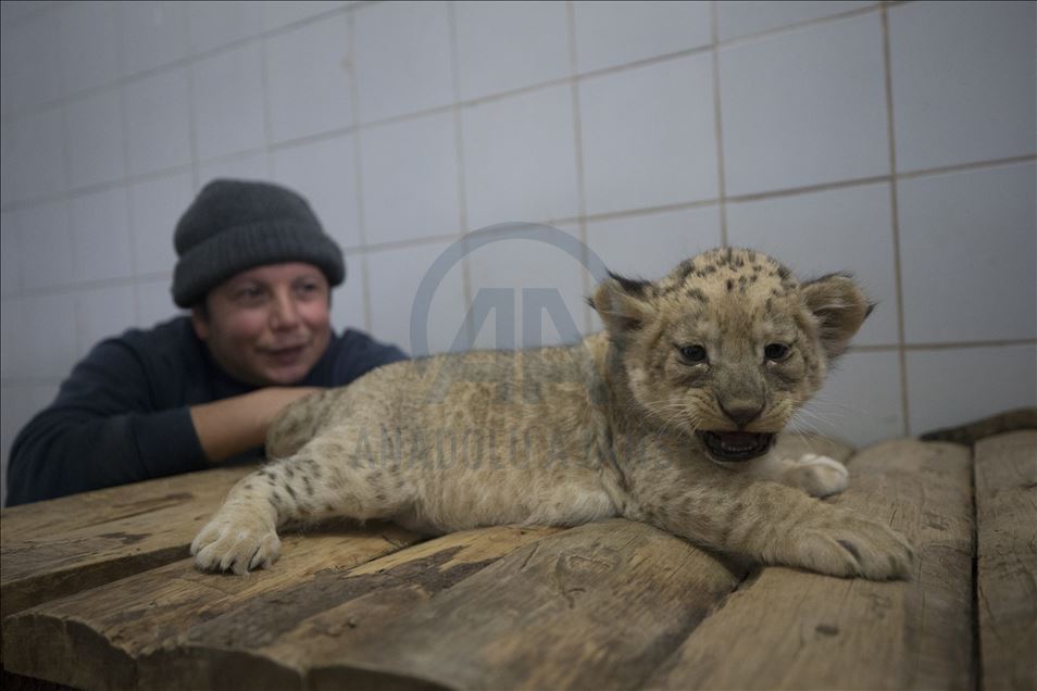 KAYSERI, TURKEY - JANUARY 13: A zookeeper is seen with lion cub, 3 weeks after its birth at the Zoo of the Kayseri Metropolitan Municipality in Kayseri, Turkey on January 13, 2020.