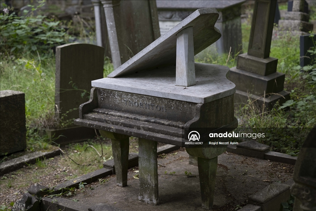 LONDON, UNITED KINGDOM - JULY 16: The piano-shaped tomb of pianist William Henry ''Harry'' Thornton, who played the piano for the soldiers during the First World War I, at the London Highgate Cemetery in London, United Kingdom on July 16, 2023. The cemetery was built in 1839, due to the inadequacy of church cemeteries in the Victorian Era. There are graves of famous names like Karl Marx, George Eliot and Douglas Adams, as the cemetery also contains different Victorian mausoleums and tombstones. ( Raşid Necati Aslım - Anadolu Agency )Raşid Necati Aslım