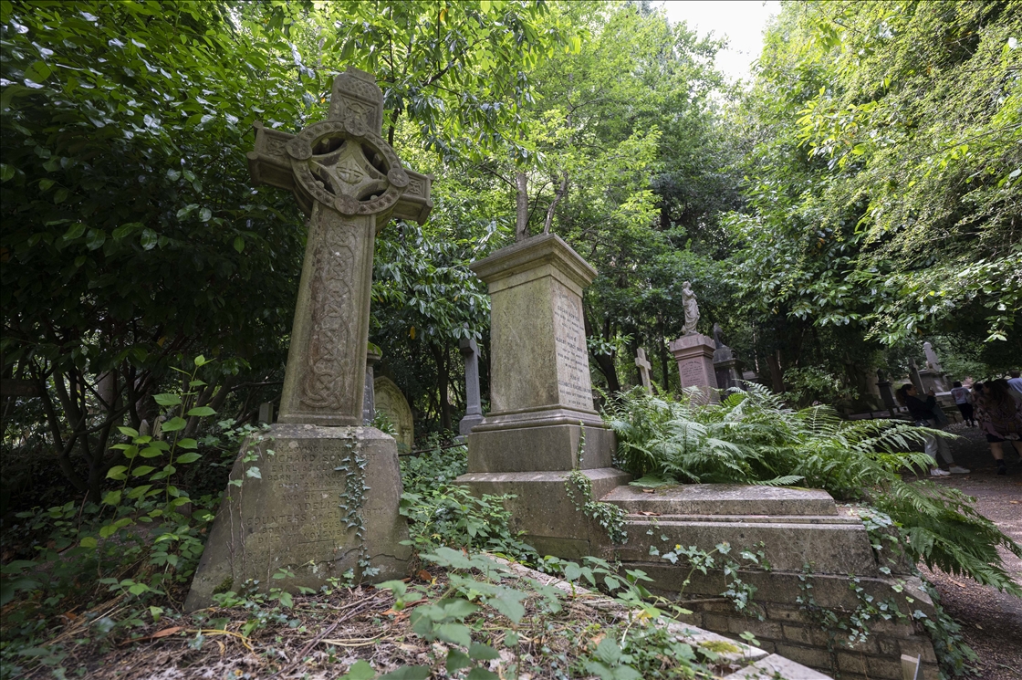 LONDON, UNITED KINGDOM - JULY 16: A view of tombstones at the London Highgate Cemetery that was built in 1839, due to the inadequacy of church cemeteries in the Victorian Era in London, United Kingdom on July 16, 2023. There are graves of famous names like Karl Marx, George Eliot and Douglas Adams, as the cemetery also contains different Victorian mausoleums and tombstones. ( Raşid Necati Aslım - Anadolu Agency )Raşid Necati Aslım