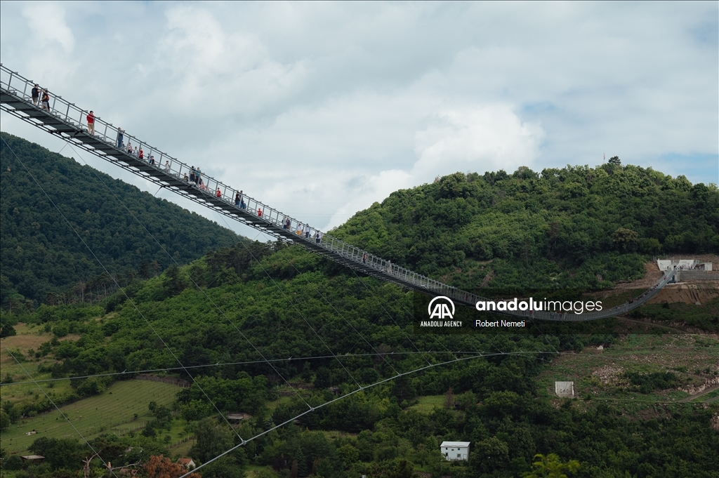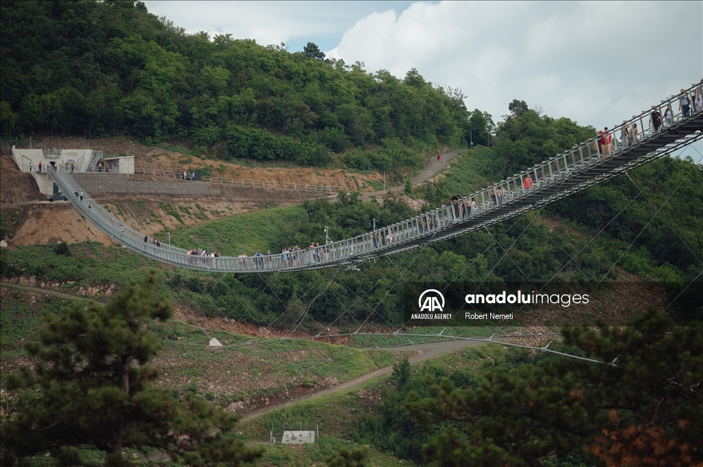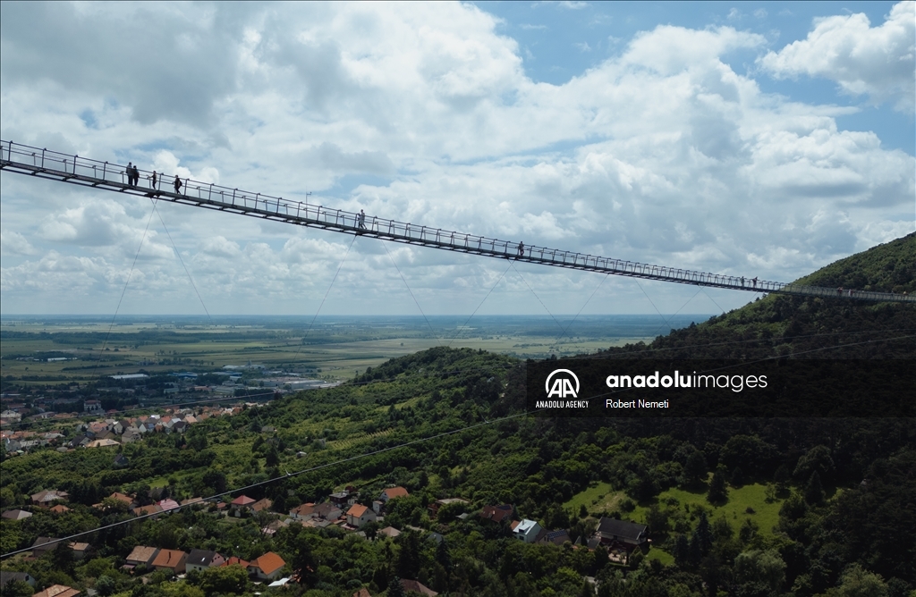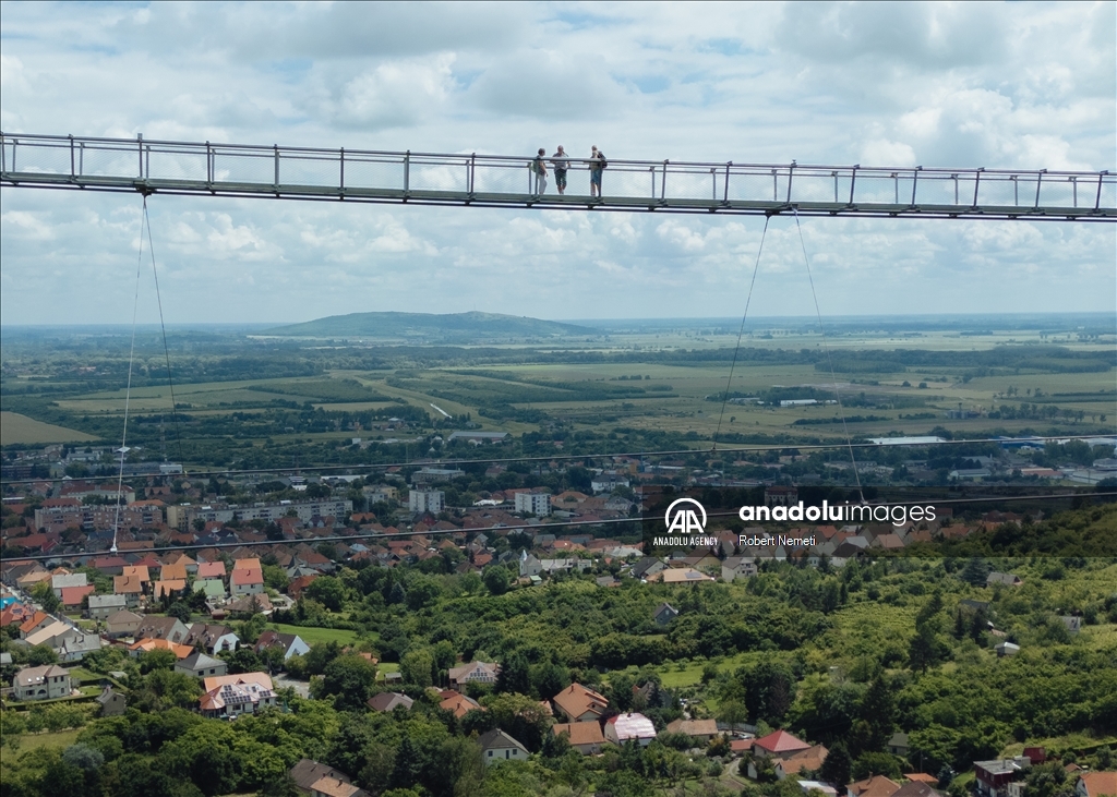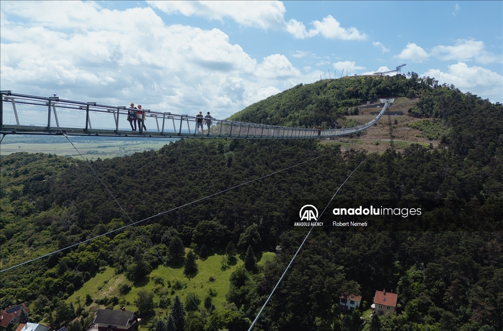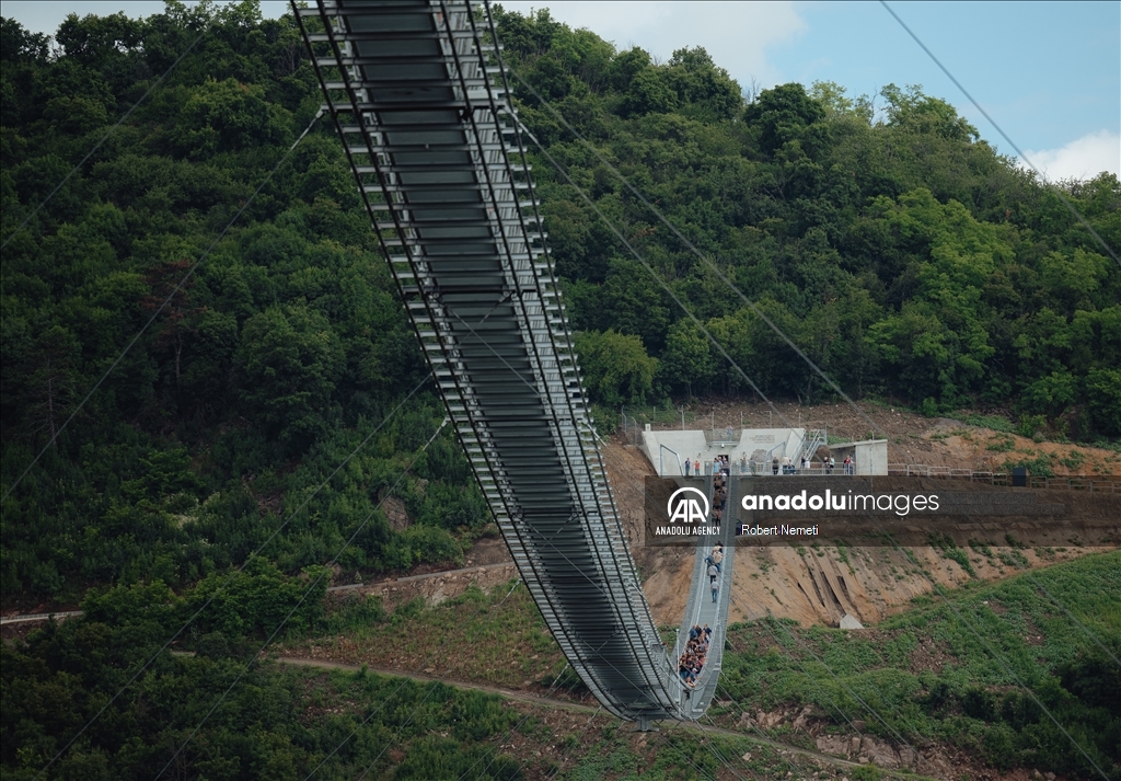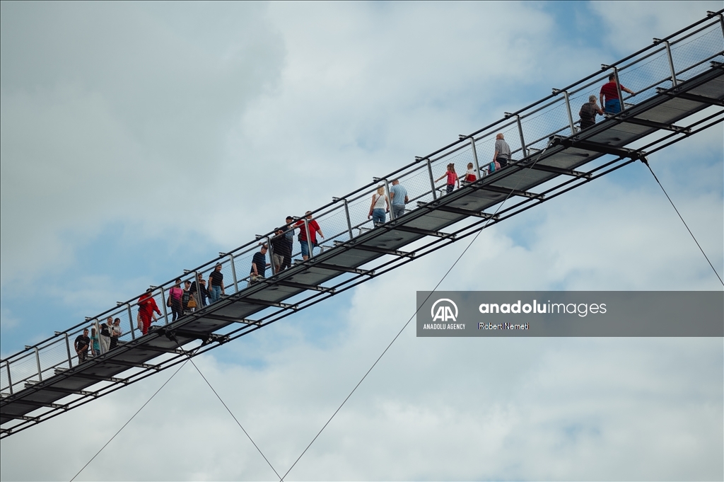SATORALJAUJHELY, HUNGARY - JUNE 5: Visitors of the world's longest two-way suspension bridge cross the structure for the very first time, which was opened to the public on 5th June 2024, in Satoraljaujhely, Hungary. The nearly 800-meter-long structure connects the two points of the city, Var-Hill and Szar-Hill, at a height of 80 meters. The bridge, which will have a glass floor in the central part, is being built as part of the Tokaj-Zemplen Development Programme, with a budget of £9.3 million (HUF 4 billion). The walkway will have a width of 1.2m and descend by 27m at its lowest point, resulting in a 15% steepness at its most extreme. The design of bridge prioritizes minimal physical impact on the landscape, eliminating the need for large pylons. Additionally, the footpath has been crafted to seamlessly blend into the silhouettes of the surrounding mountains. The new pedestrian bridge will later become part of the Zemplen Adventure Park, a fully municipal project. ( Robert Nemeti - Anadolu Agency )Robert Nemeti