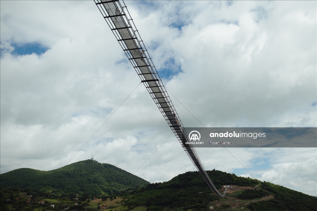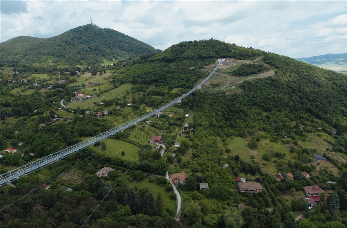 SATORALJAUJHELY, HUNGARY - JUNE 5: An aerial view of the world's longest two-way suspension bridge, which was opened to the public on 5th June 2024, in Satoraljaujhely, Hungary. The nearly 800-meter-long structure connects the two points of the city, Var-Hill and Szar-Hill, at a height of 80 meters. The bridge, which will have a glass floor in the central part, is being built as part of the Tokaj-Zemplen Development Programme, with a budget of £9.3 million (HUF 4 billion). The walkway will have a width of 1.2m and descend by 27m at its lowest point, resulting in a 15% steepness at its most extreme. The design of bridge prioritizes minimal physical impact on the landscape, eliminating the need for large pylons. Additionally, the footpath has been crafted to seamlessly blend into the silhouettes of the surrounding mountains. The new pedestrian bridge will later become part of the Zemplen Adventure Park, a fully municipal project. ( Robert Nemeti - Anadolu Agency )Robert Nemeti