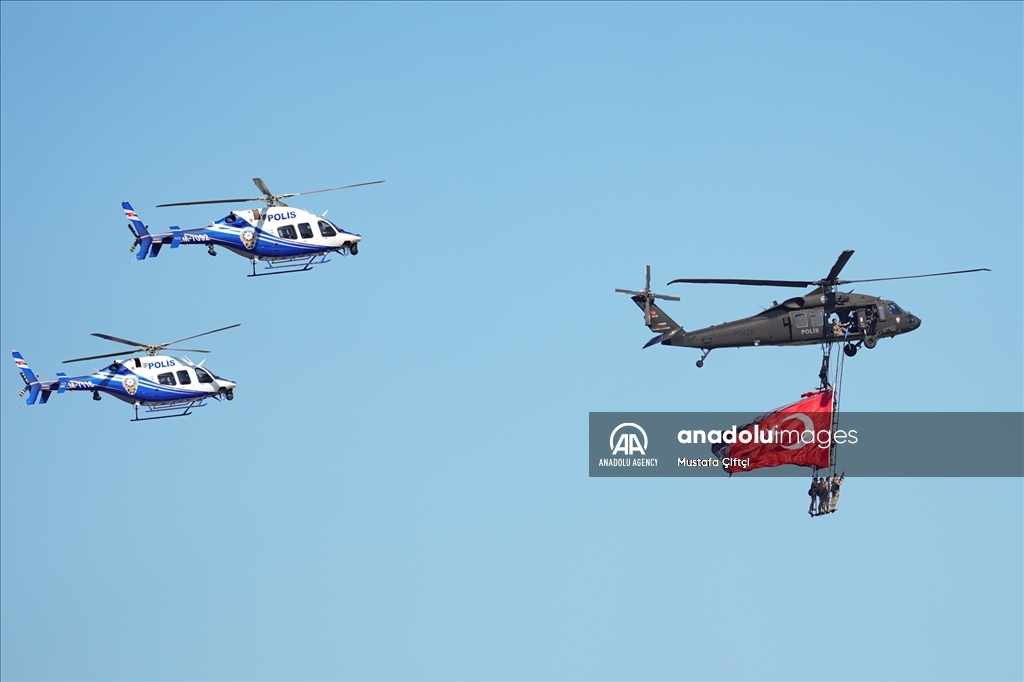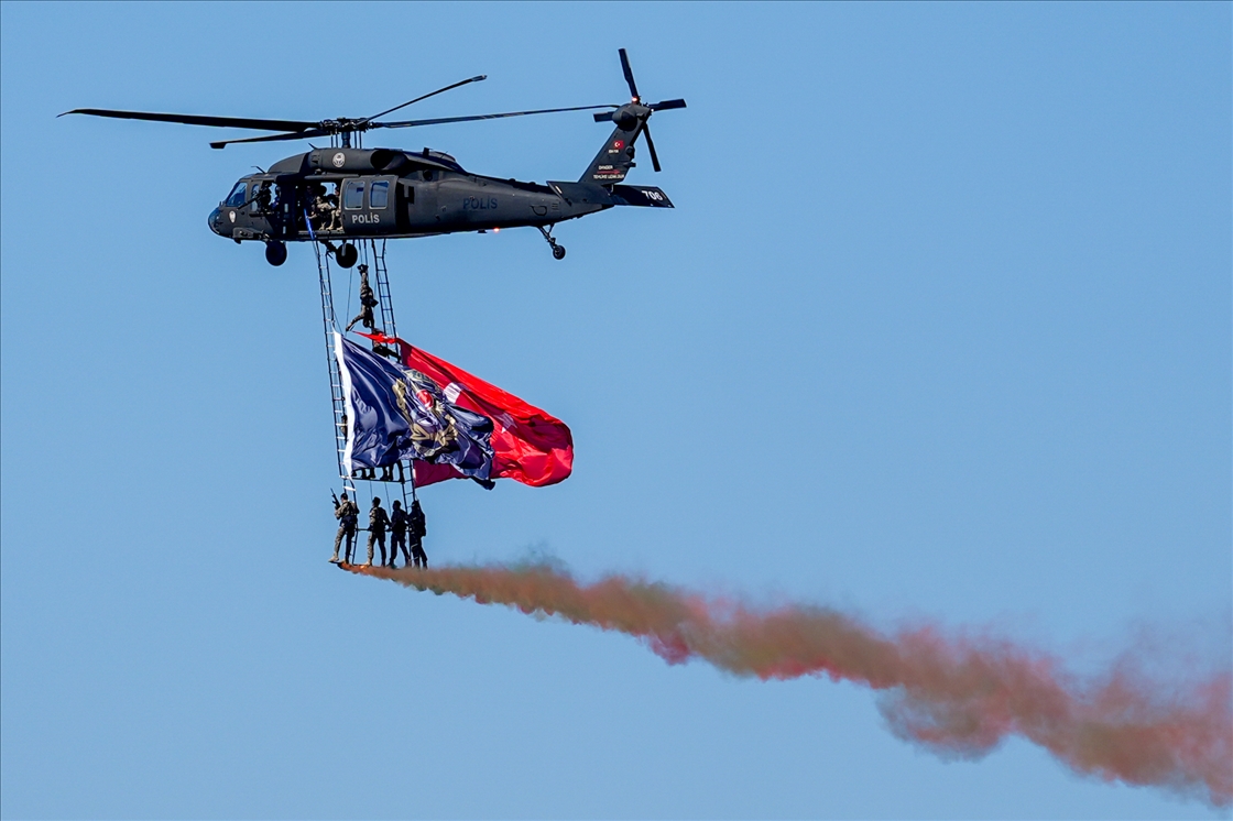 ADANA, TURKIYE - OCTOBER 3: Police Special Operations teams perform demonstration on the second day of Turkiye's premier technology and aerospace event TEKNOFEST, held at Adana Airport in Adana, Turkiye on October 3, 2024. The four-day event will feature competitions, air shows, exhibitions and workshops. The event has been organized by the Turkish Technology Team (T3) Foundation and the Turkish Industry and Technology Ministry jointly since 2018, in cooperation with dozens of ministries, public institutions, private firms, and universities. ( Mustafa Çiftçi - Anadolu Agency )Mustafa Çiftçi