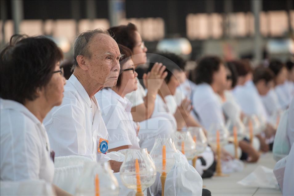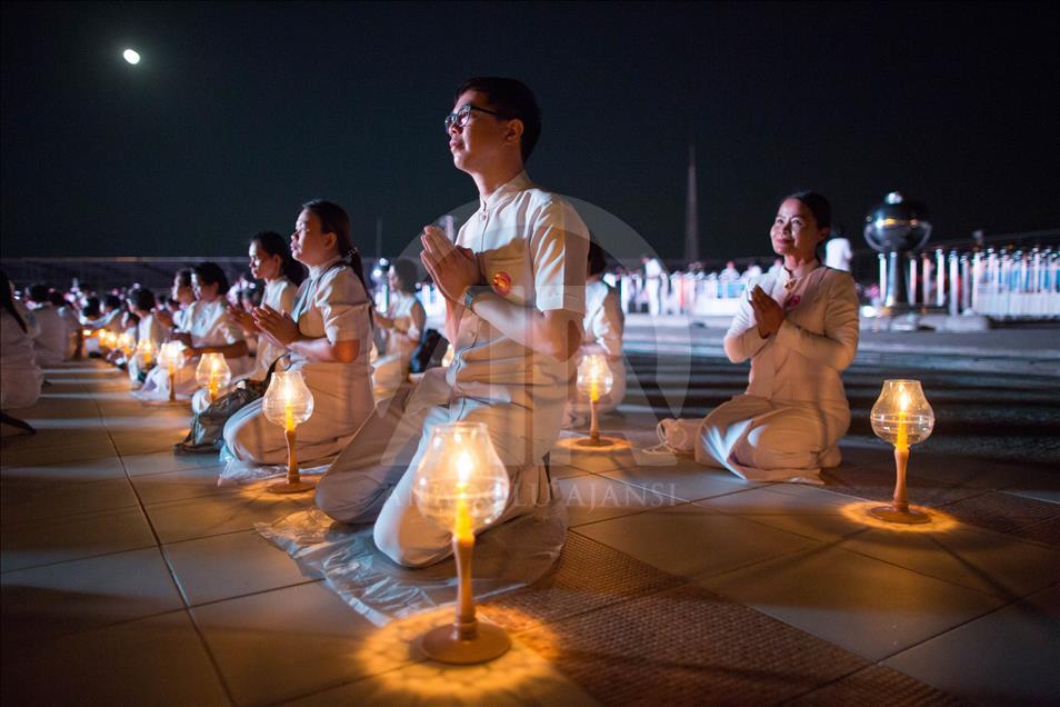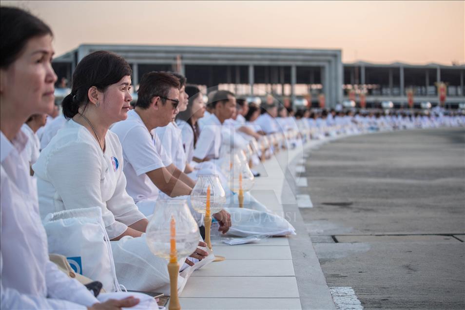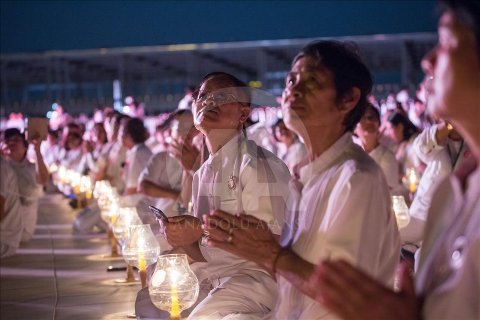 BANGKOK, THAILAND - FEBRUARY 19: Devotees are seen praying during the yearly ceremony in the north of Bangkok, Thailand on February 19, 2019. Thai people celebrate the buddhist festival of clockwise circumambulation and Makha Bucha lantern lighting ceremony at Dhammakaya Temple on 'Makha Bucha Day' during the third lunar moon, where around 1250 monks gathered to be ordained by the Buddha and hundreds thousand of devotees holding lanterns. ( Guillaume Payen - Anadolu Agency )Guillaume Payen