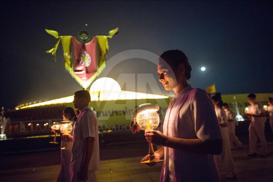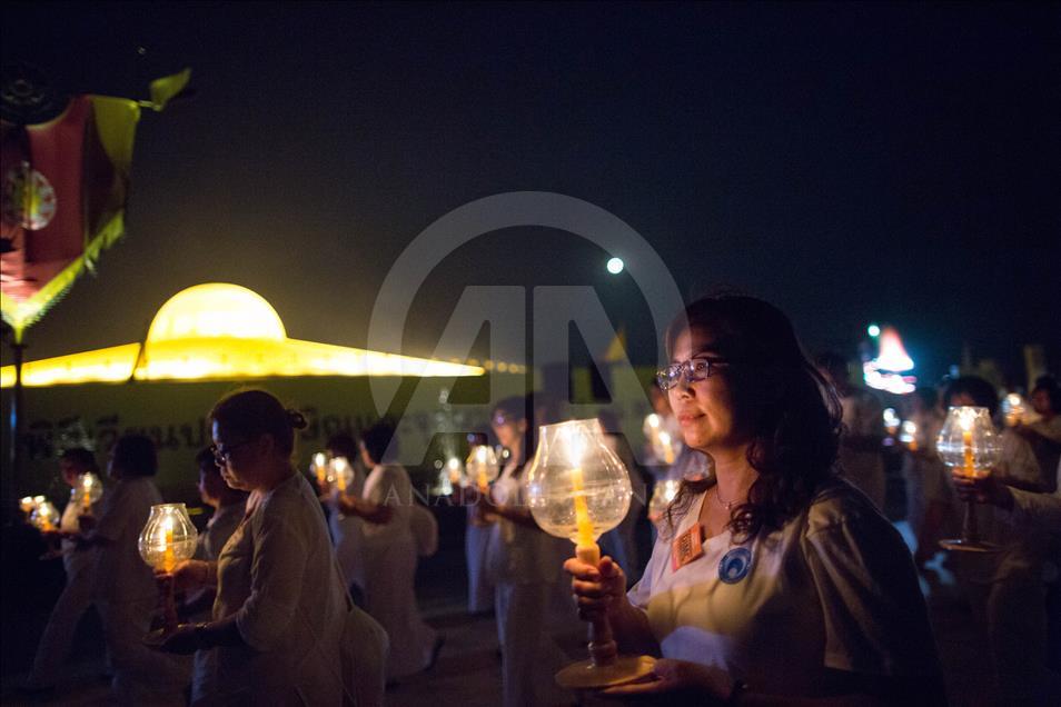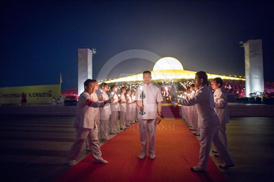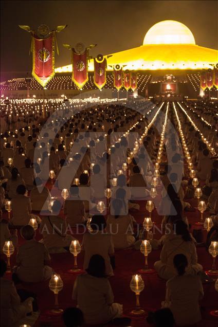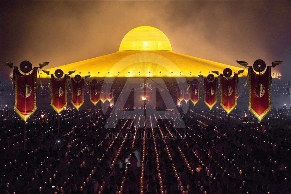 BANGKOK, THAILAND - FEBRUARY 19: Devotees light candles during a yearly ceremony at Wat Phra Dhammakaya Temple in the north of Bangkok, Thailand on February 19, 2019. Thai people celebrate the buddhist festival of clockwise circumambulation and Makha pratipa lantern lighting ceremony at Dhammakaya Temple on 'Makha Bucha Day' during the third lunar moon, where around 1250 monks gathered to be ordained by the Buddha. ( Guillaume Payen - Anadolu Agency )Guillaume Payen