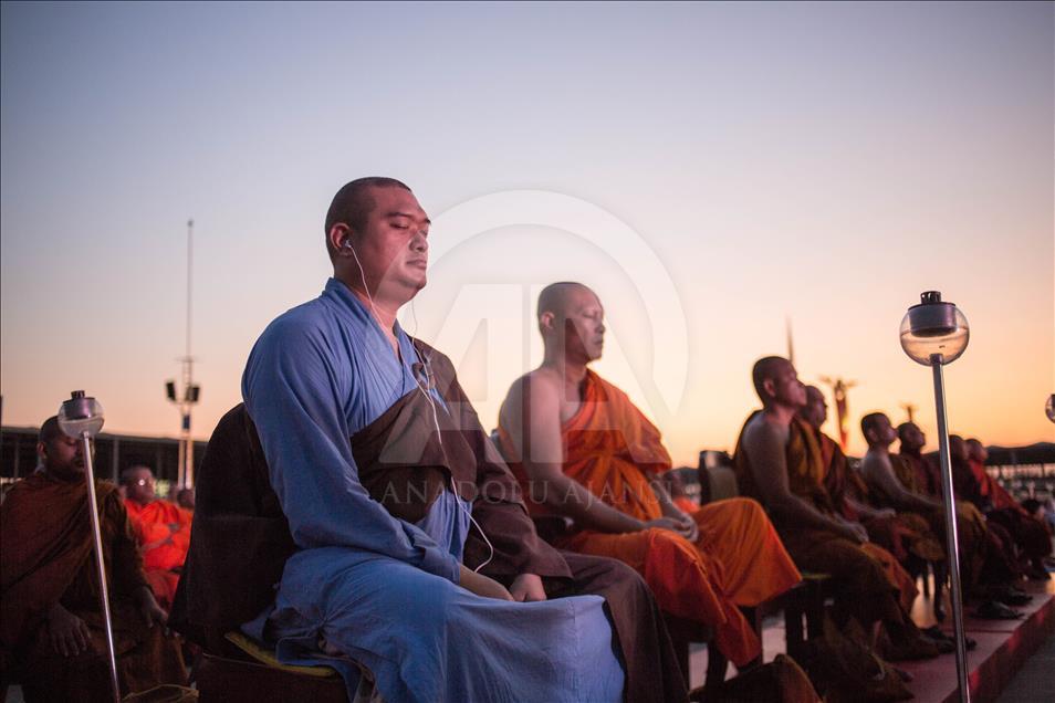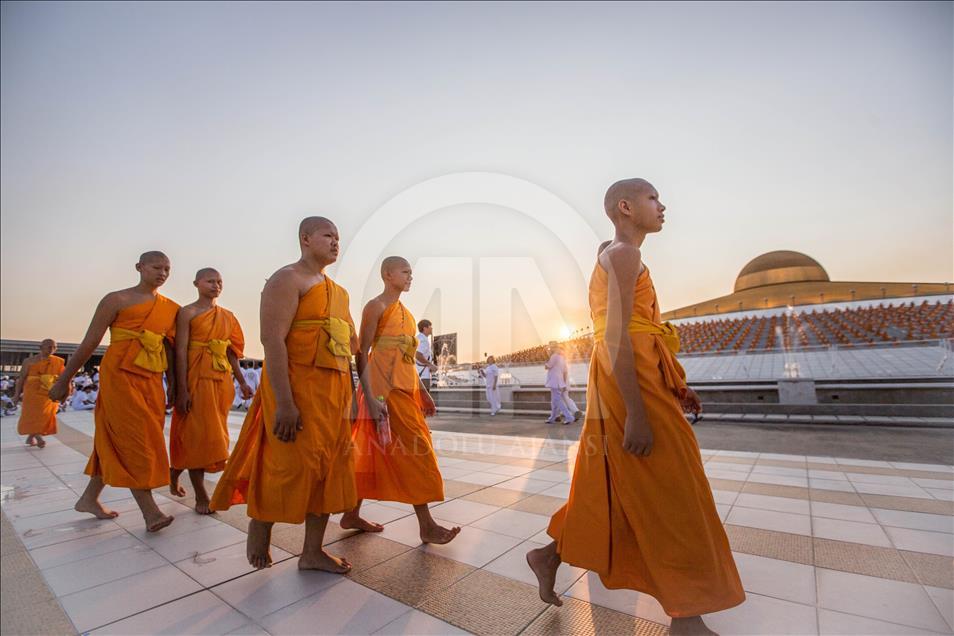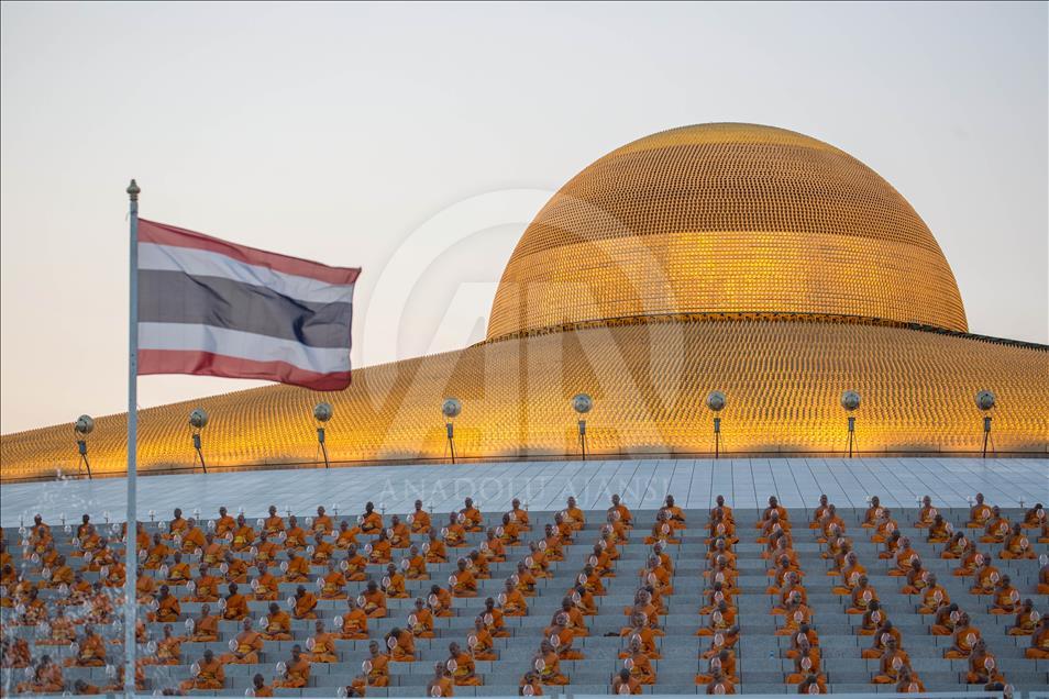 BANGKOK, THAILAND - FEBRUARY 19: Foreign monks are seen praying during the yearly ceremony in the north of Bangkok, Thailand on February 19, 2019. Thai people celebrate the buddhist festival of clockwise circumambulation and Makha Bucha lantern lighting ceremony at Dhammakaya Temple on 'Makha Bucha Day' during the third lunar moon, where around 1250 monks gathered to be ordained by the Buddha and hundreds thousand of devotees holding lanterns. ( Guillaume Payen - Anadolu Agency )Guillaume Payen