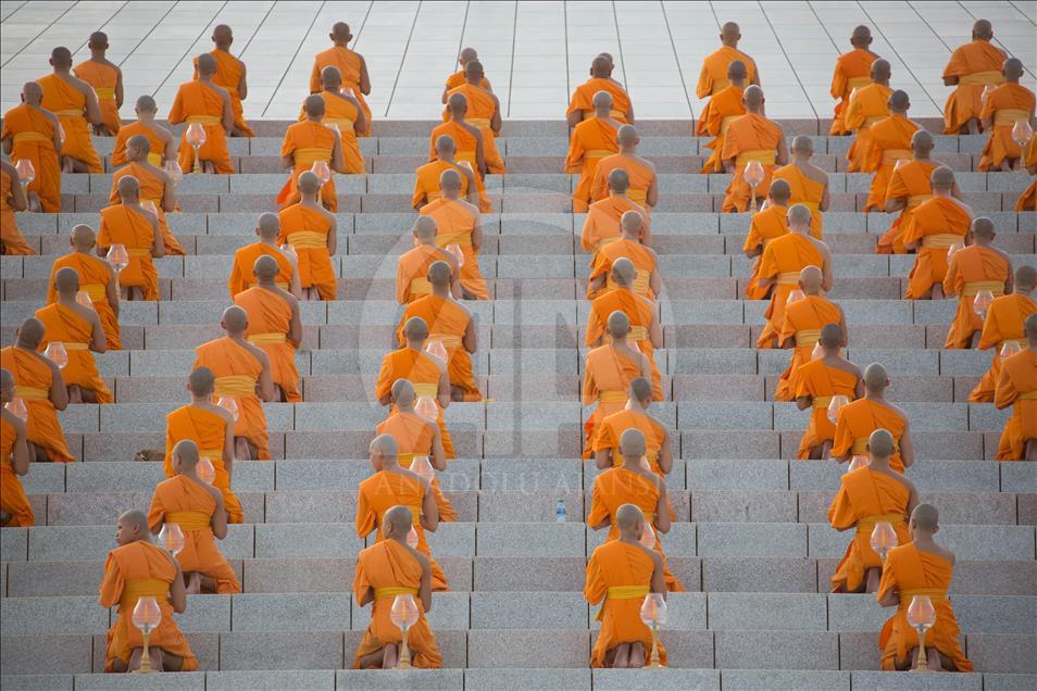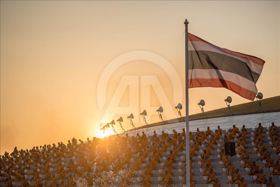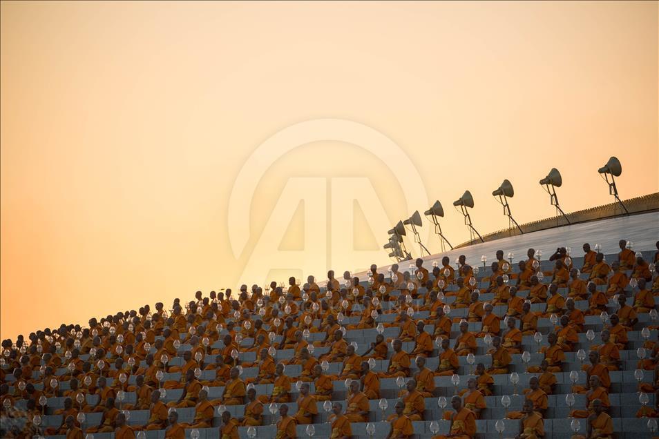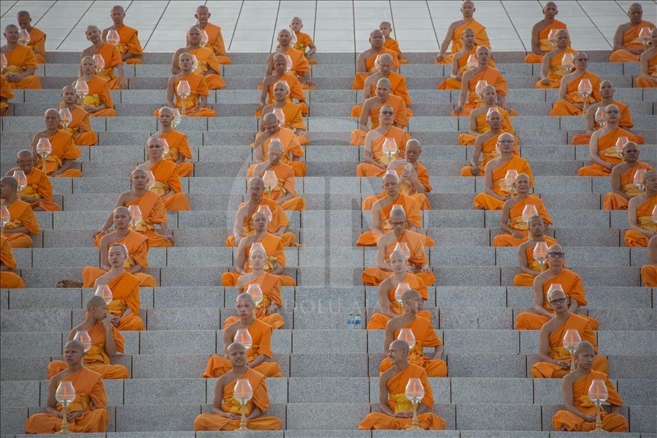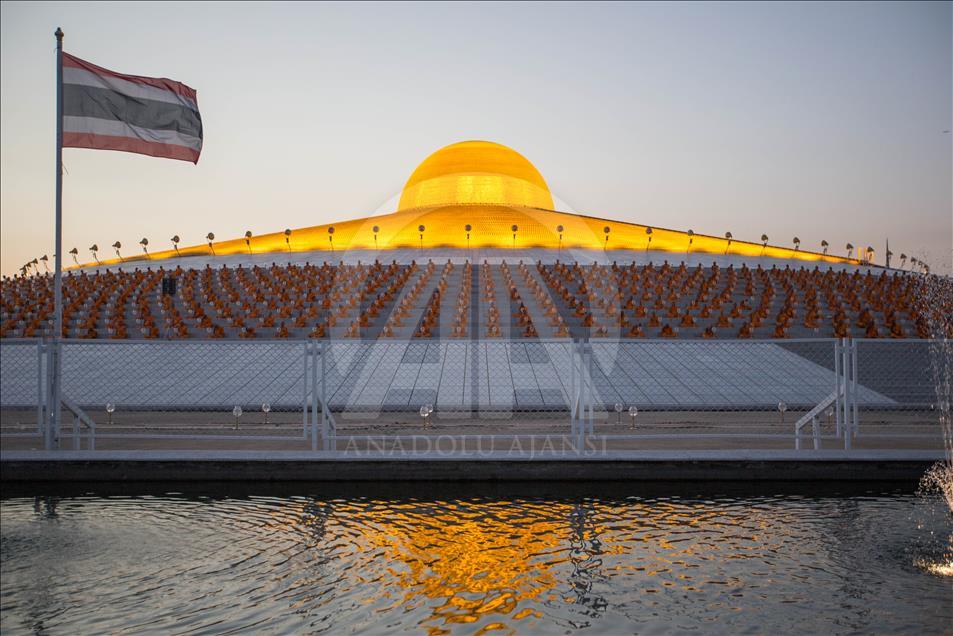 BANGKOK, THAILAND - FEBRUARY 19: Buddhist monks pray during a yearly ceremony at Wat Phra Dhammakaya Temple in the north of Bangkok, Thailand on February 19, 2019. Thai people celebrate the buddhist festival of clockwise circumambulation and Makha pratipa lantern lighting ceremony at Dhammakaya Temple on 'Makha Bucha Day' during the third lunar moon, where around 1250 monks gathered to be ordained by the Buddha. ( Guillaume Payen - Anadolu Agency )Guillaume Payen