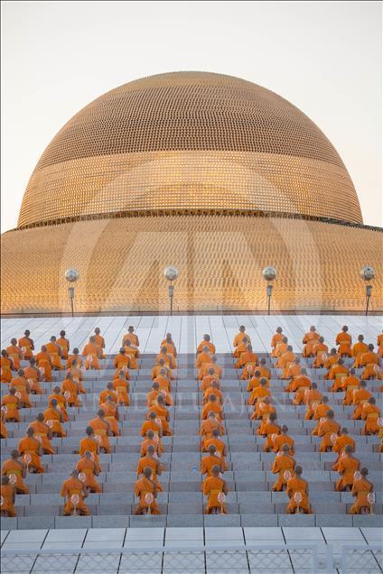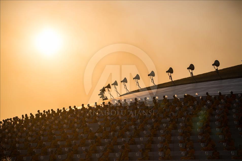 Buddhist monks pray during a yearly ceremony at Wat Phra Dhammakaya Temple in the north of Bangkok, Thailand on February 19, 2019.