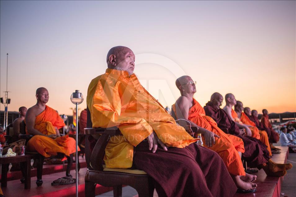 BANGKOK, THAILAND - FEBRUARY 19: Monks are seen holding lanterns during the yearly ceremony in the north of Bangkok, Thailand on February 19, 2019. Thai people celebrate the buddhist festival of clockwise circumambulation and Makha Bucha lantern lighting ceremony at Dhammakaya Temple on 'Makha Bucha Day' during the third lunar moon, where around 1250 monks gathered to be ordained by the Buddha and hundreds thousand of devotees holding lanterns. ( Guillaume Payen - Anadolu Agency )Guillaume Payen