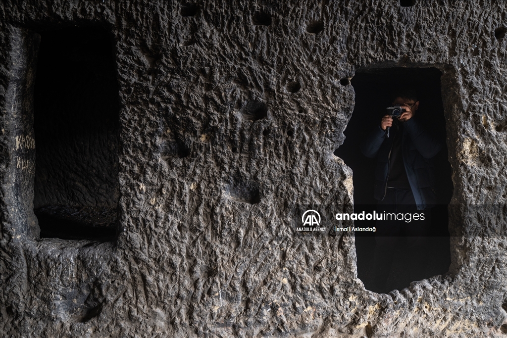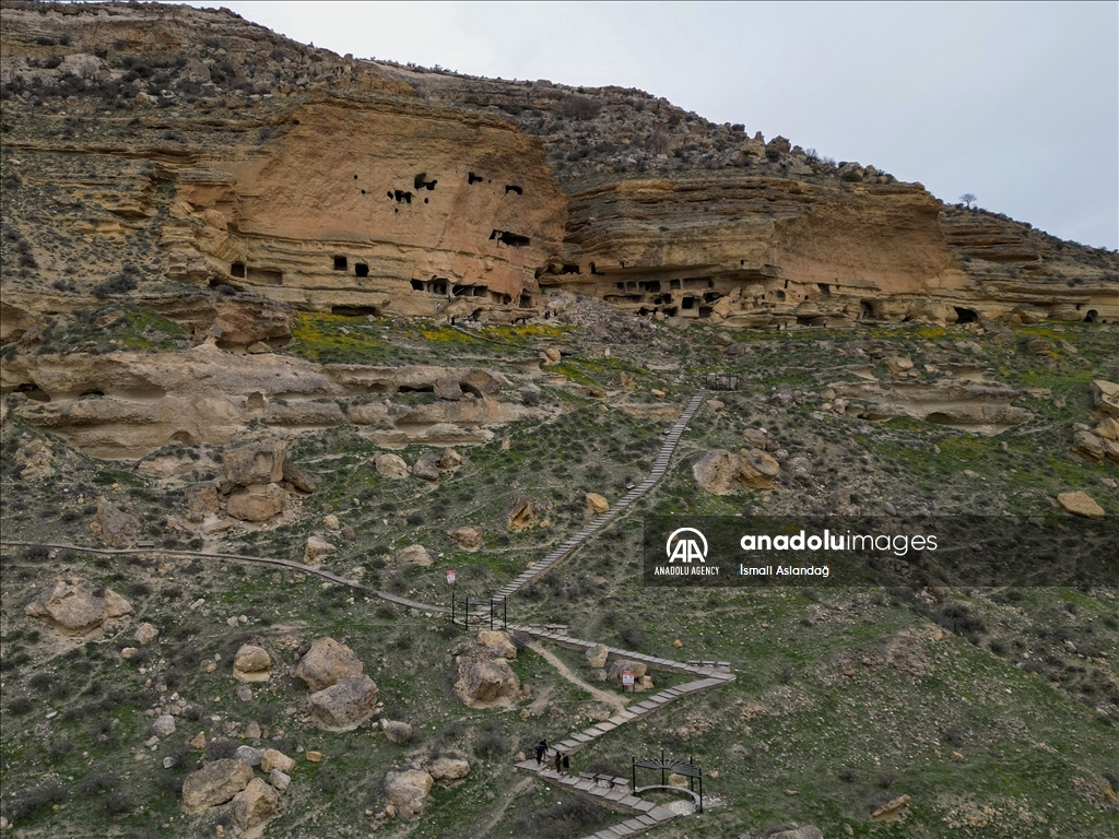 KARAMAN, TURKIYE - MARCH 31: A view of the Manazan Caves, located within the borders of Taskale Town in Karaman, Turkiye on March 31, 2025. Manazan Caves is a five-story settlement carved entirely by human hands into a massive rock formation. The first two floors consist of numerous small, cell-like rooms, while the remaining levels are locally known as Kumkale, At Meydanı (Horse Square), and Oluler Meydanı (Square of the Dead). The lower floors feature many burial chambers and two chapels. A well-preserved female corpse from the Byzantine period, discovered in the uppermost gallery known as the Square of the Dead, is currently on display at the Karaman Museum. ( İsmail Aslandağ - Anadolu Agency )İsmail Aslandağ