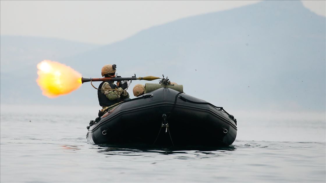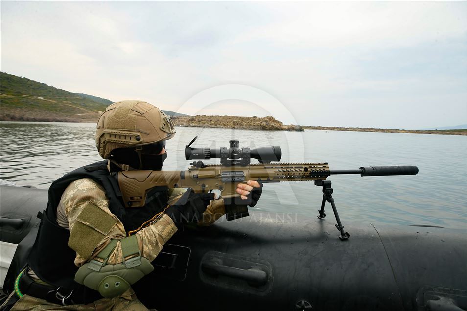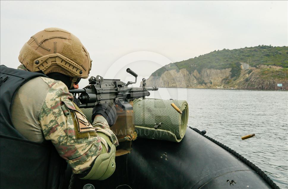 IZMIR, TURKEY - NOVEMBER 13: Members of Marine Amphibious Unit of Turkish Armed Forces attend a training at Amphibious Marine Brigade in Foca district of Izmir, Turkey on November 13, 2019. ( Emin Mengüarslan - Anadolu Agency )Emin Mengüarslan