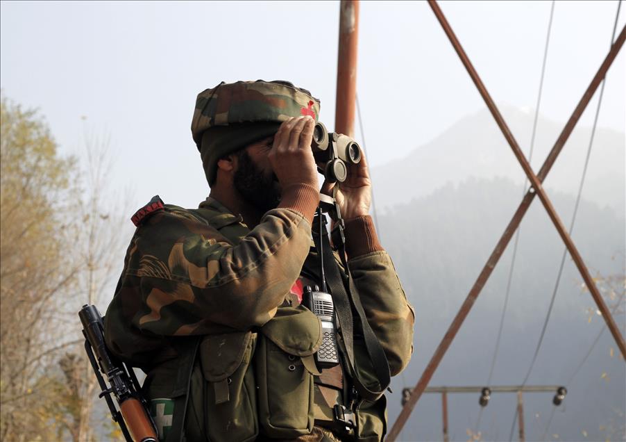 URI, KASHMIR, DECMEBER – 5: An Indian army men look through his binoculars on top of a mountain, during an encounter between suspected militants and Army soldiers on their base at Mohra, in Uri, 100 kms from capital Srinagar on December 5, 2014. Militants sneaked into an Indian army camp in Kashmir on Friday morning killing at least ten soldiers and police in their bunkers, the worst losses for security forces in more than a year. Photo Ahmer Khan/Anadolu AgencyAhmer Khan