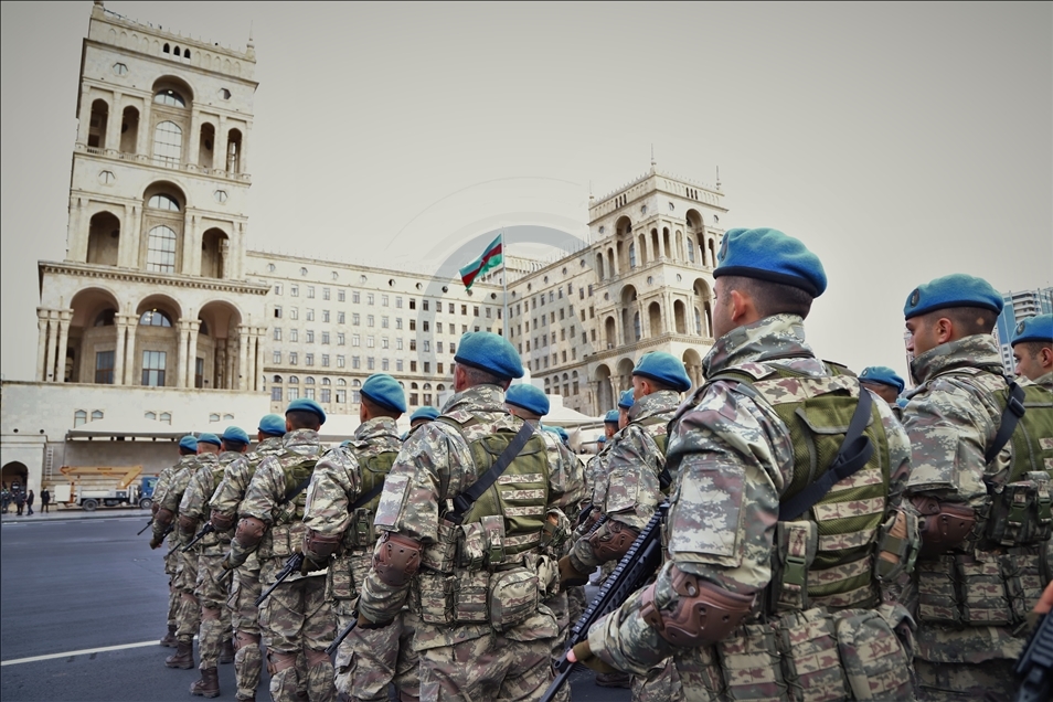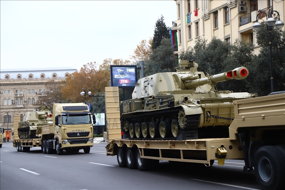 Turkish and Azerbaijani soldiers take part in the rehearsals in the streets of Baku ahead of the military parade, which will be held to mark the Azerbaijani Army's entrance to Nagorno-Karabakh.